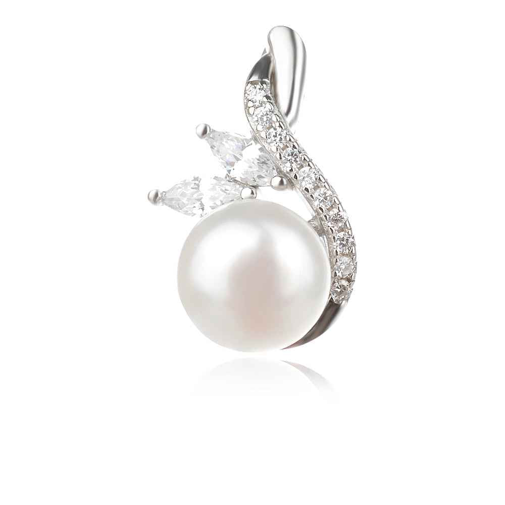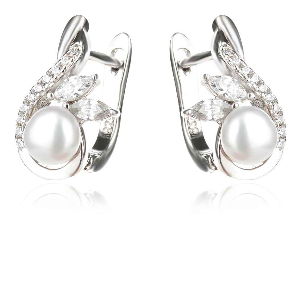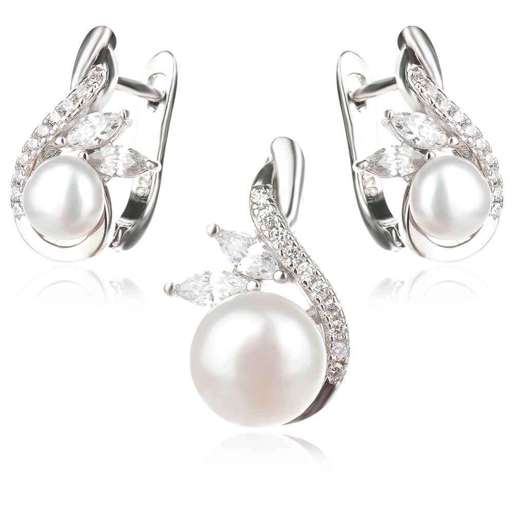 Сребърен комплект от обеци и медальон с изящен дизайн с бели перли и цирконий. Перлите са монтирани на щифт. Обеците са на удобно английско закопчаване.