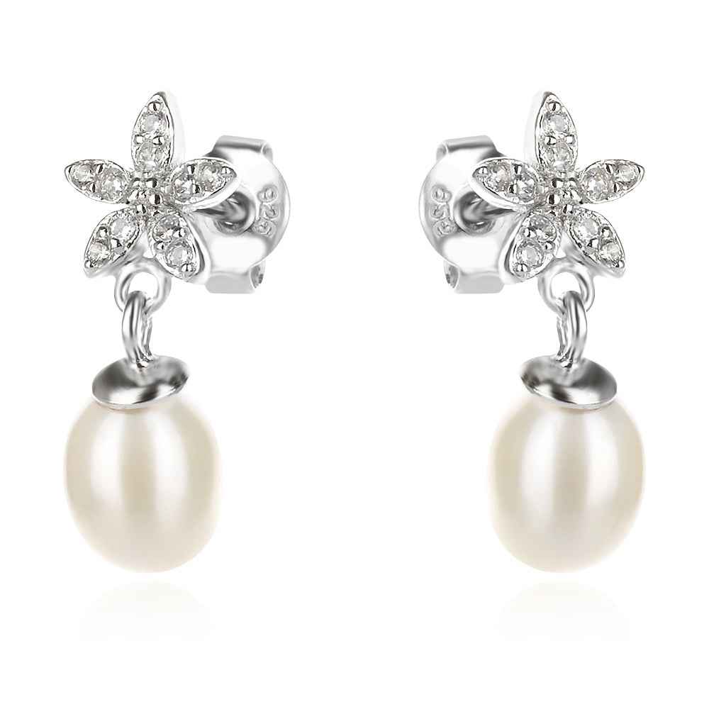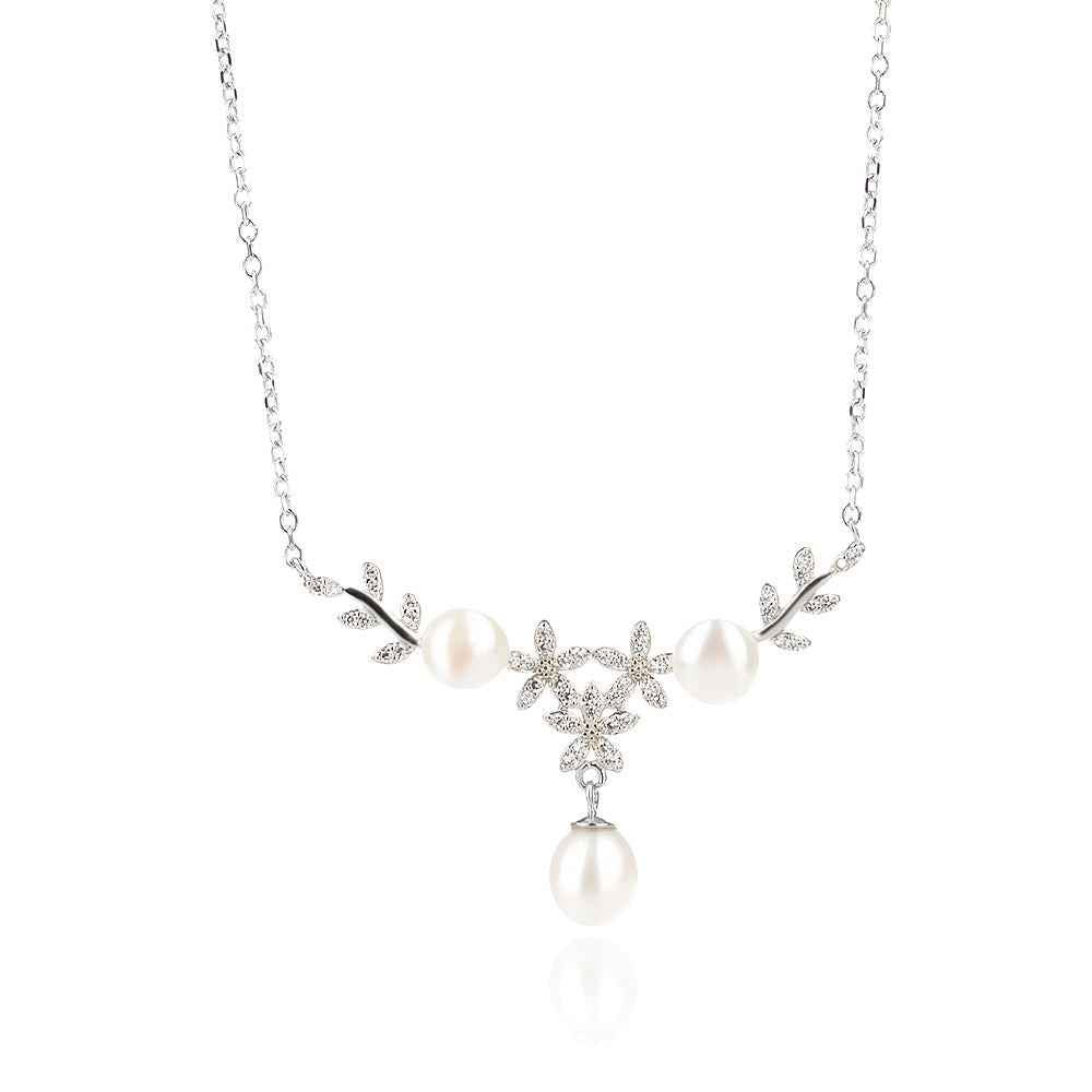 Сребърен комплект от колие и обеци с форма на цветчета и бели култивирани перли. Бижу за онези специални моменти, когато искате да съчетаете вечната класика с деликатност и романтичен дух.