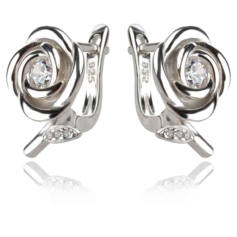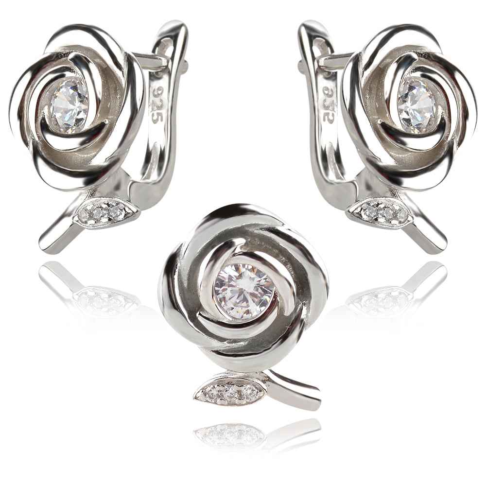 Сребърен комплект включващ обеци и медальон във флорална форма и инкрустирани циркони. Обеците са добре балансирани с удобно английско закопчаване и прилягат плътно към ухото. Прекрасен малък сет, с който да допълните романтична визия.