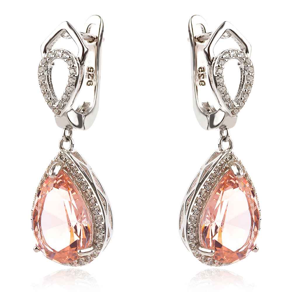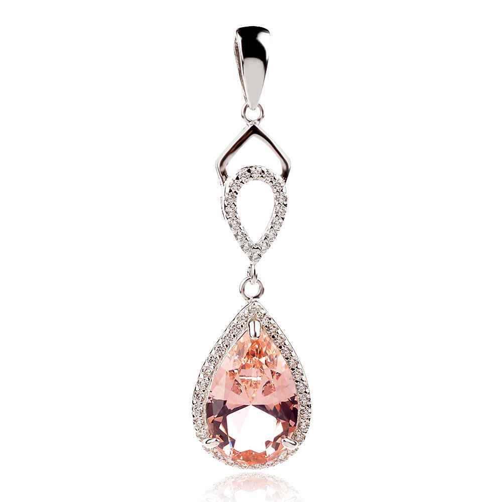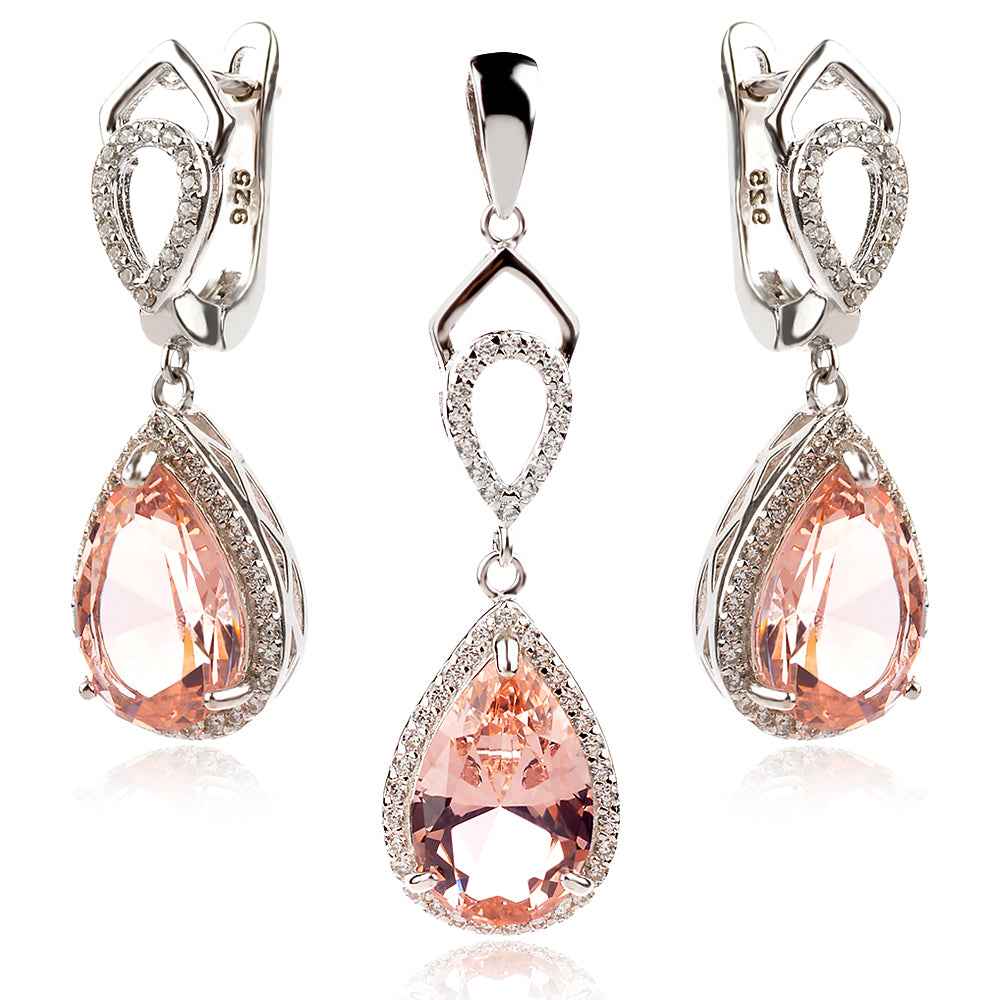 Впечатляващ сребърен комплект с нежно розов морганит капка в семпъл обков с циркони. Комплектът включва медальон и обеци на удобно английско закопчаване.