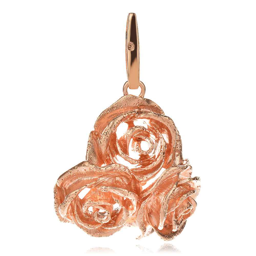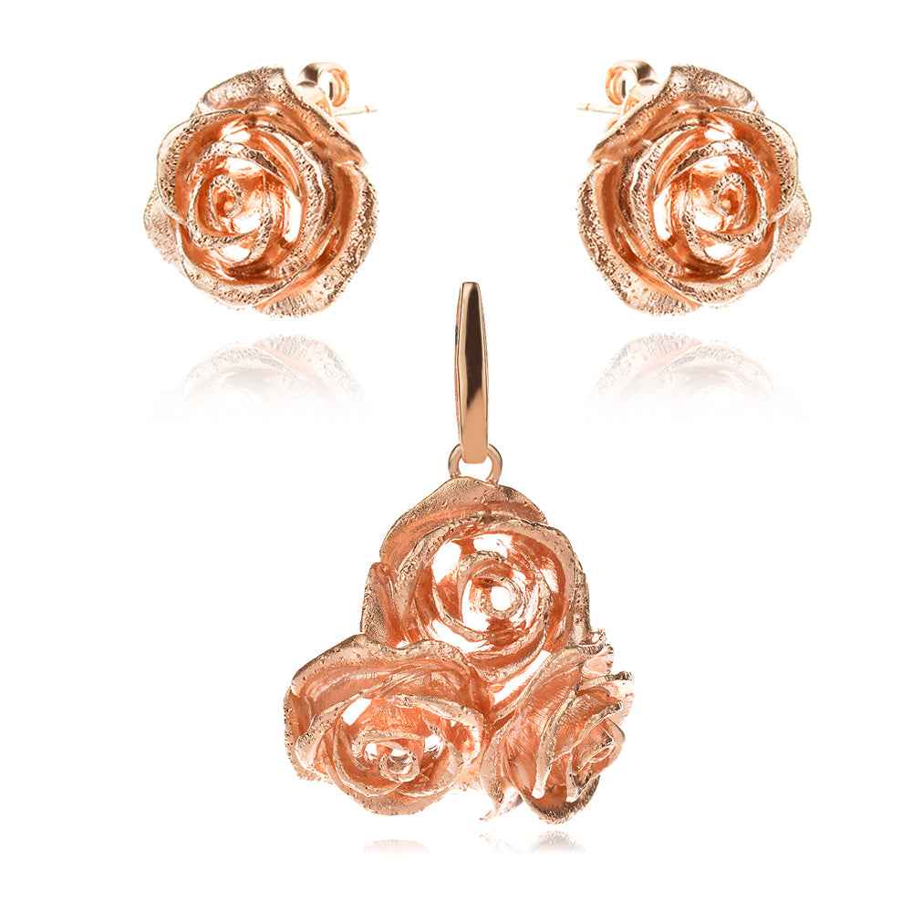 Изискан сребърен комплект от 3D рози с розова позлата и фина диамантена обработка. Бижуто е емблематичен модел на италианския луксозен бранд GANEZZI. Обеците са на щифт с винт и плътно прилягат към ухото.