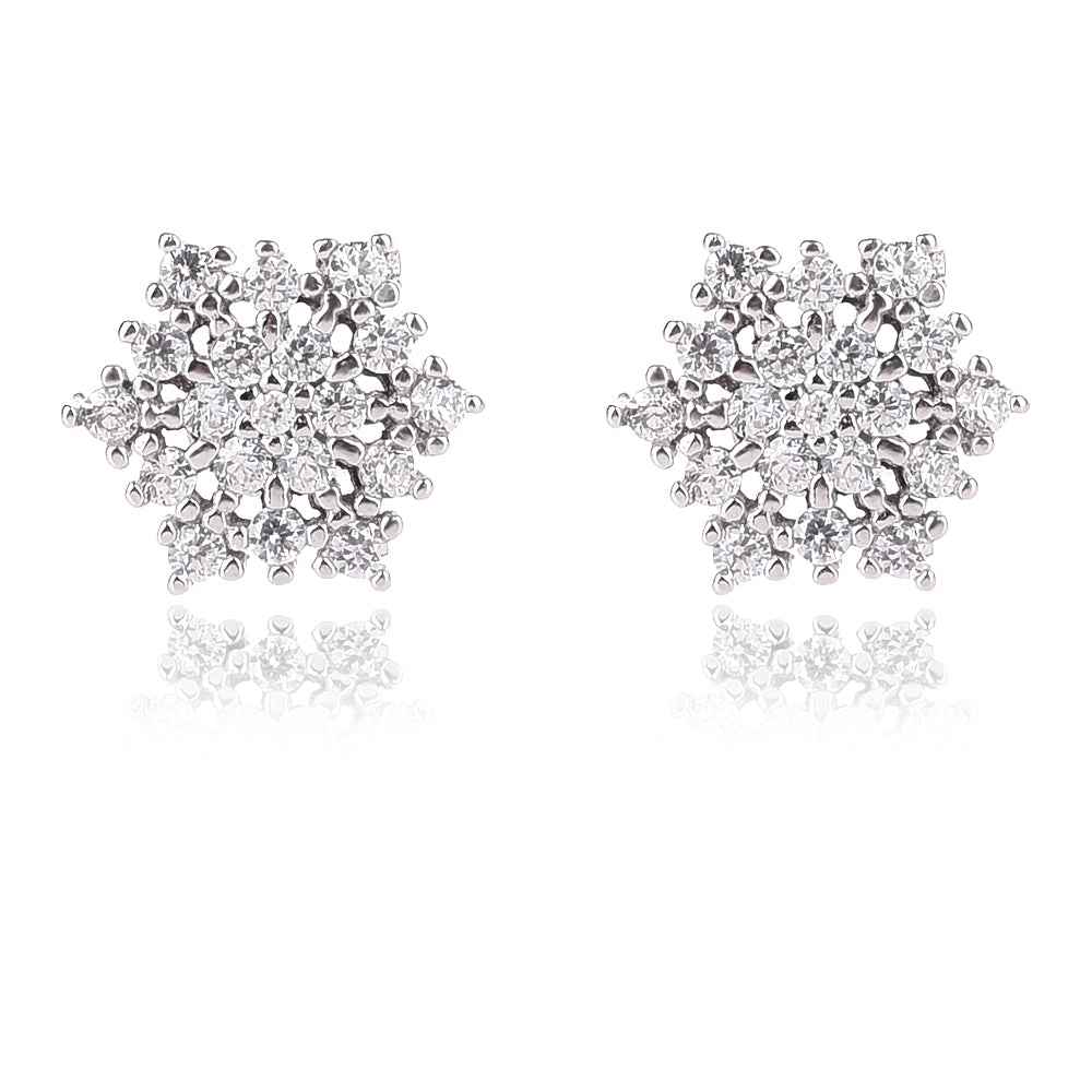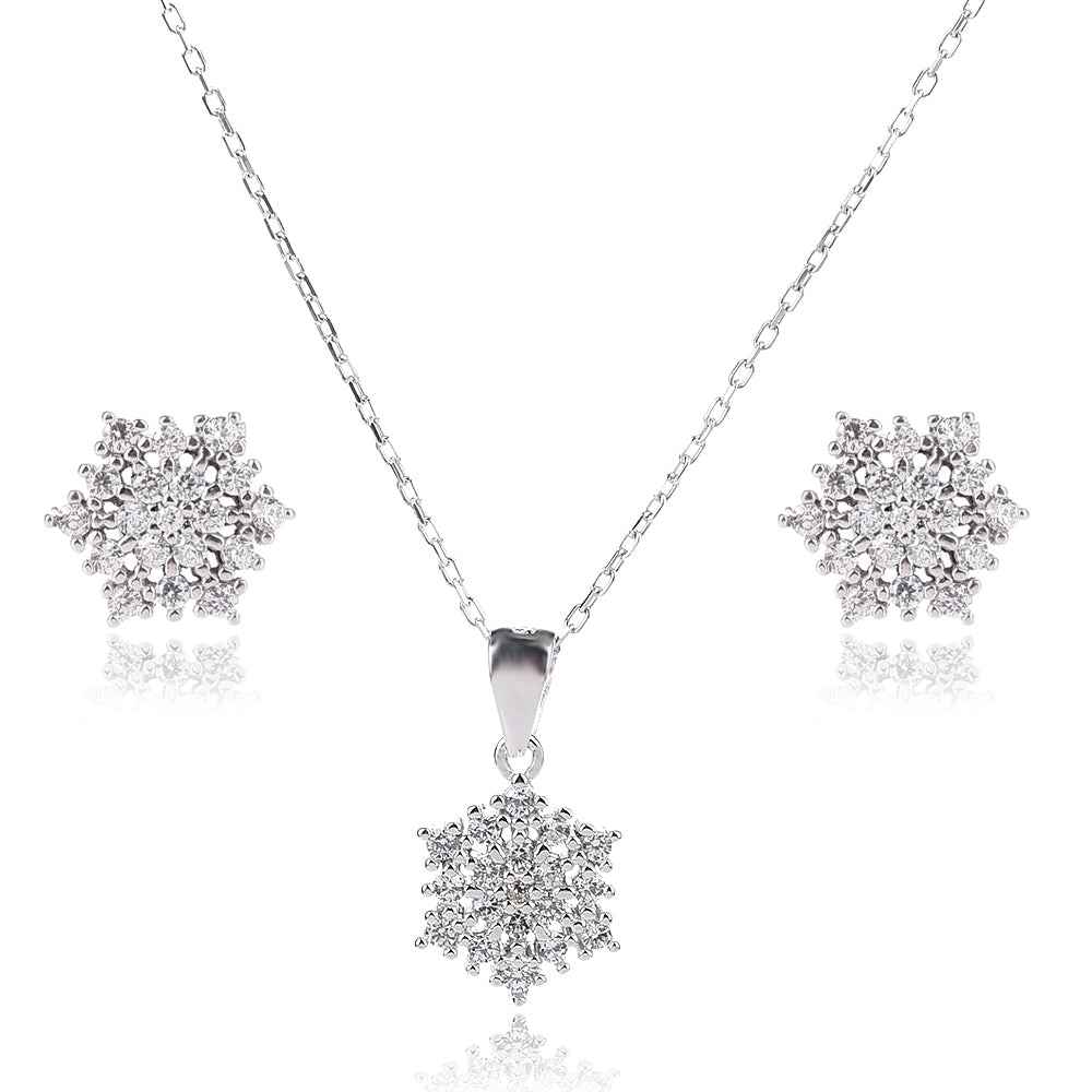 Сребърен комплект снежинки, обсипани с цирконии. Комплектът включва малки обеци на щифт и колие. Нежни и изящни, тези малки тематични украшения ще зарадват всяка кокетка през празничните зимни месеци.