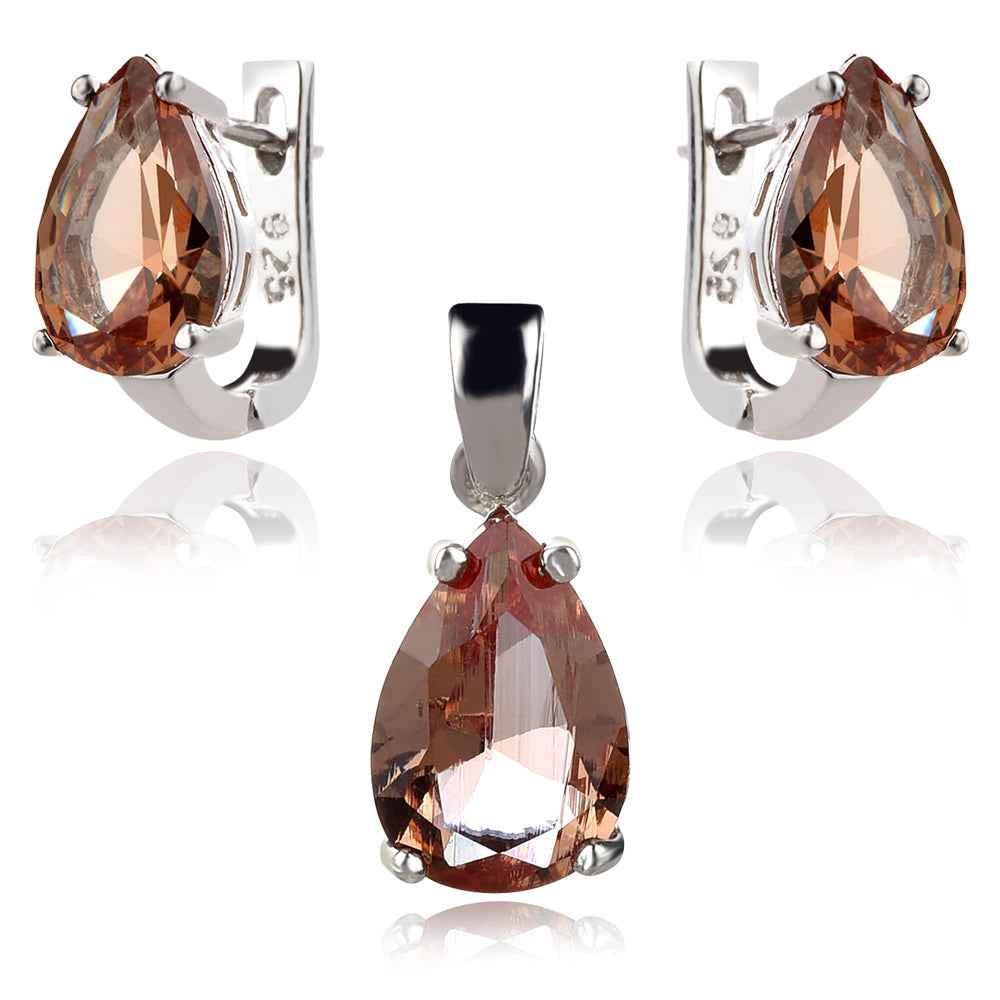 Сребърен комплект с фасетиран лабораторен султанит под формата на капка в семпъл обков. Комплектът включва обеци и медальон. Обеците са на удобно английски закопчаване и перфектно прилягат към ухото.