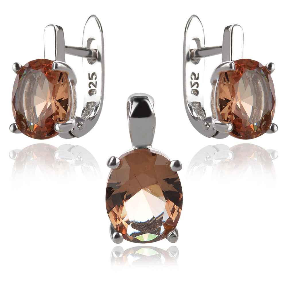Сребърен комплект с фасетиран лабораторен султанит под формата на елипса. Комплектът включва обеци и медальон. Обеците са на удобно английски закопчаване и перфектно прилягат към ухото.