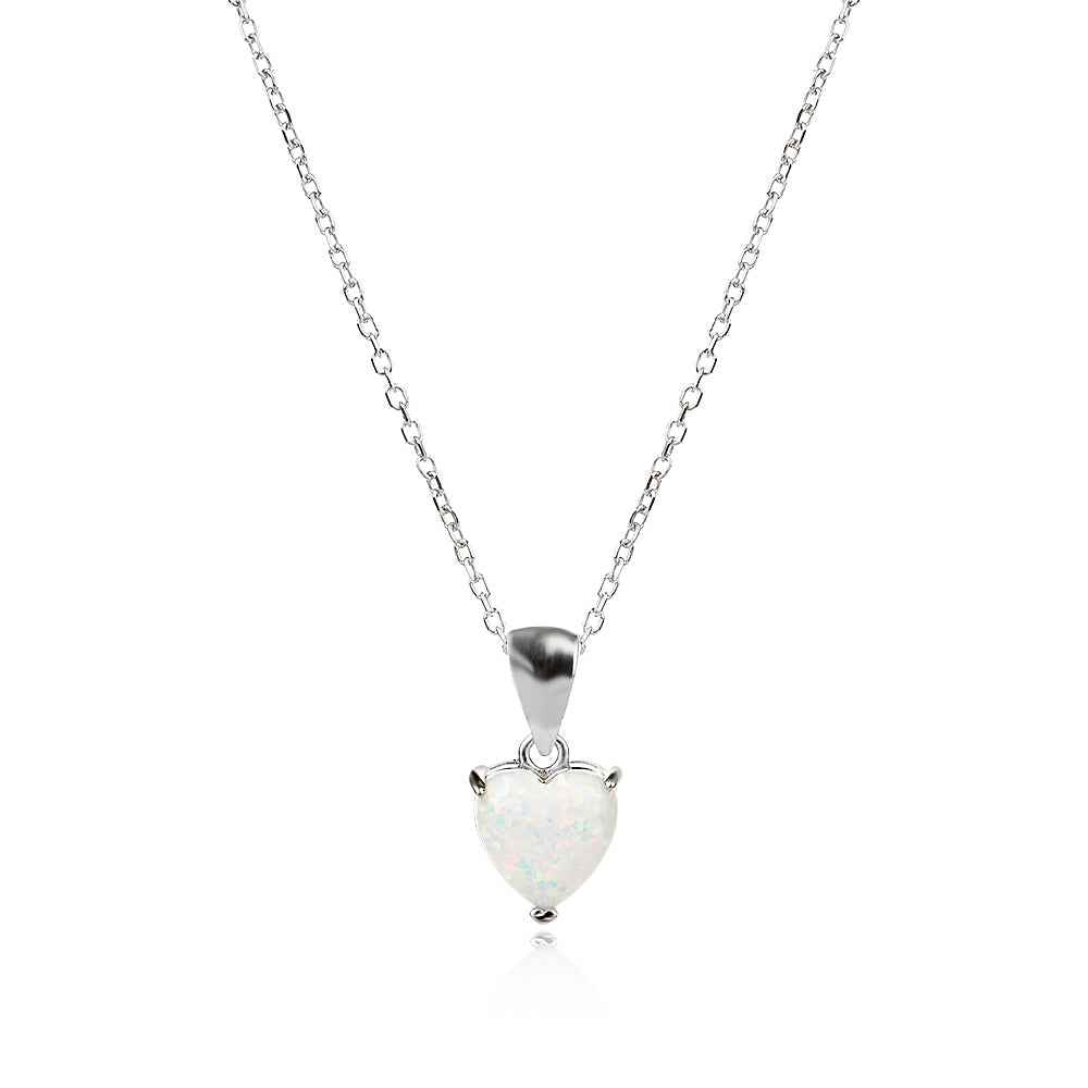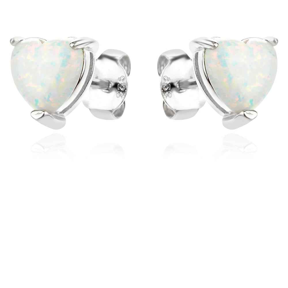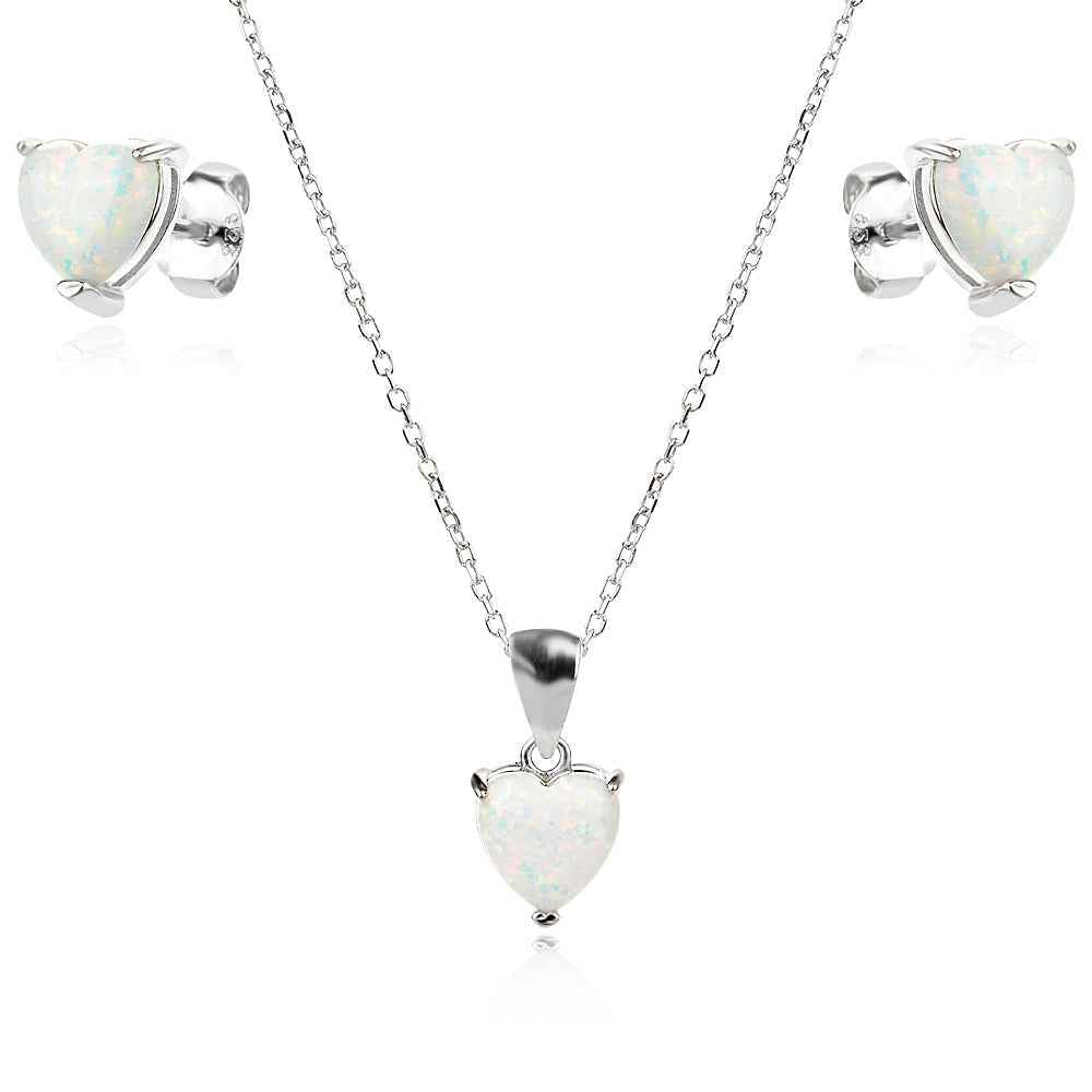 Сребърен комплект от малки обеци и медальонче във форма на сърце с пресован бял опал. Един деликатен детайл, с който да добавите свежест и фин блясък към визията. Обеците се закопчават на щифт.