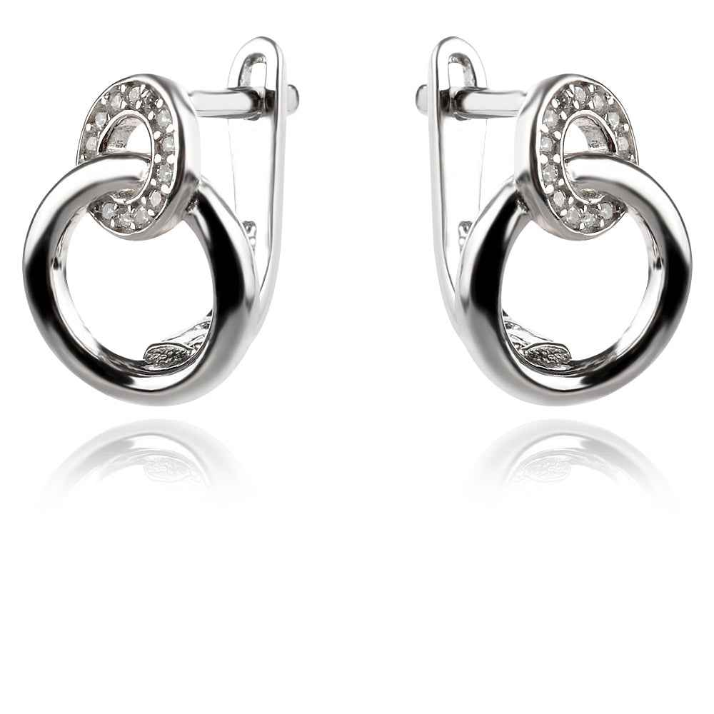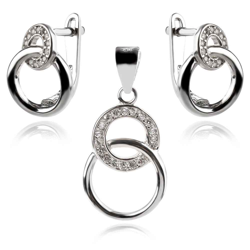 Сребърен комплект от обеци и медальон с геометрична форма. Обеците са с удобно английско закопчаване. Комплектът е с родиево покритие, което предпазва среброто от оксидация.