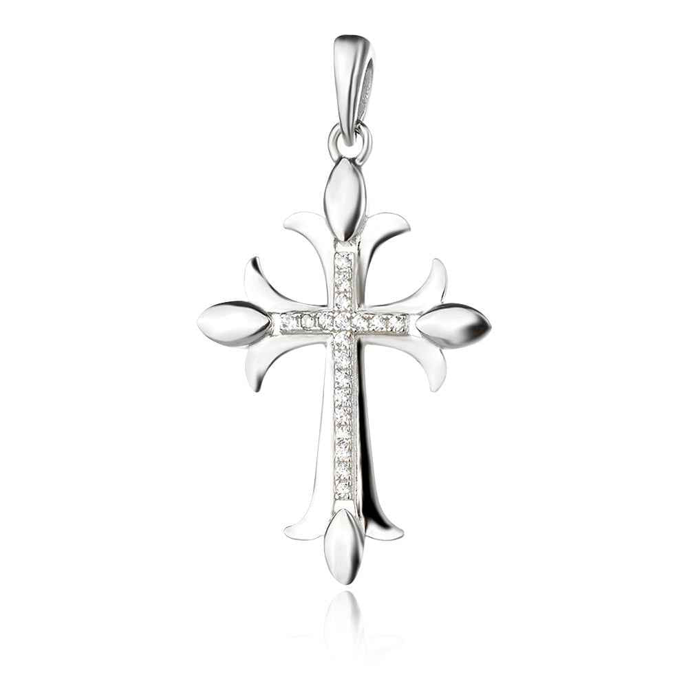 Сребърен кръст с цирконии и родиево покритие, което предпазва среброто от оксидация.