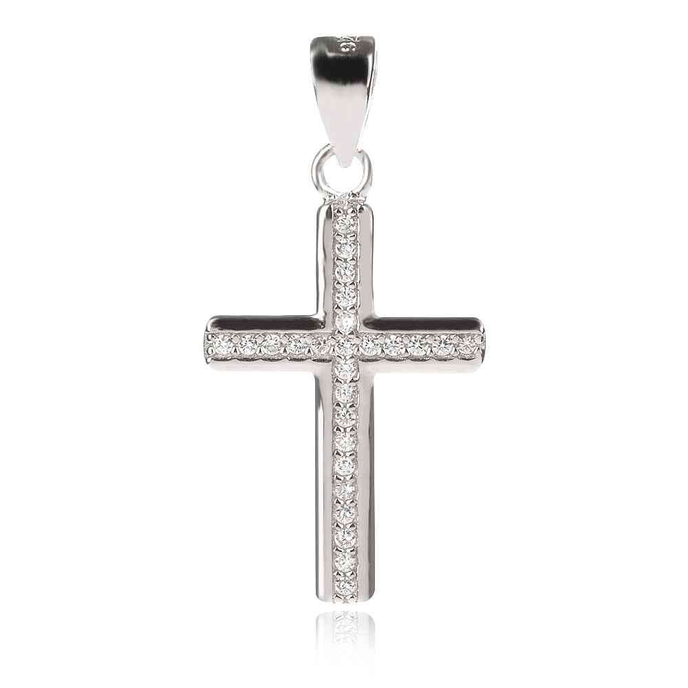 Сребърен кръст с цирконии и родиево покритие, което предпазва среброто от оксидация.