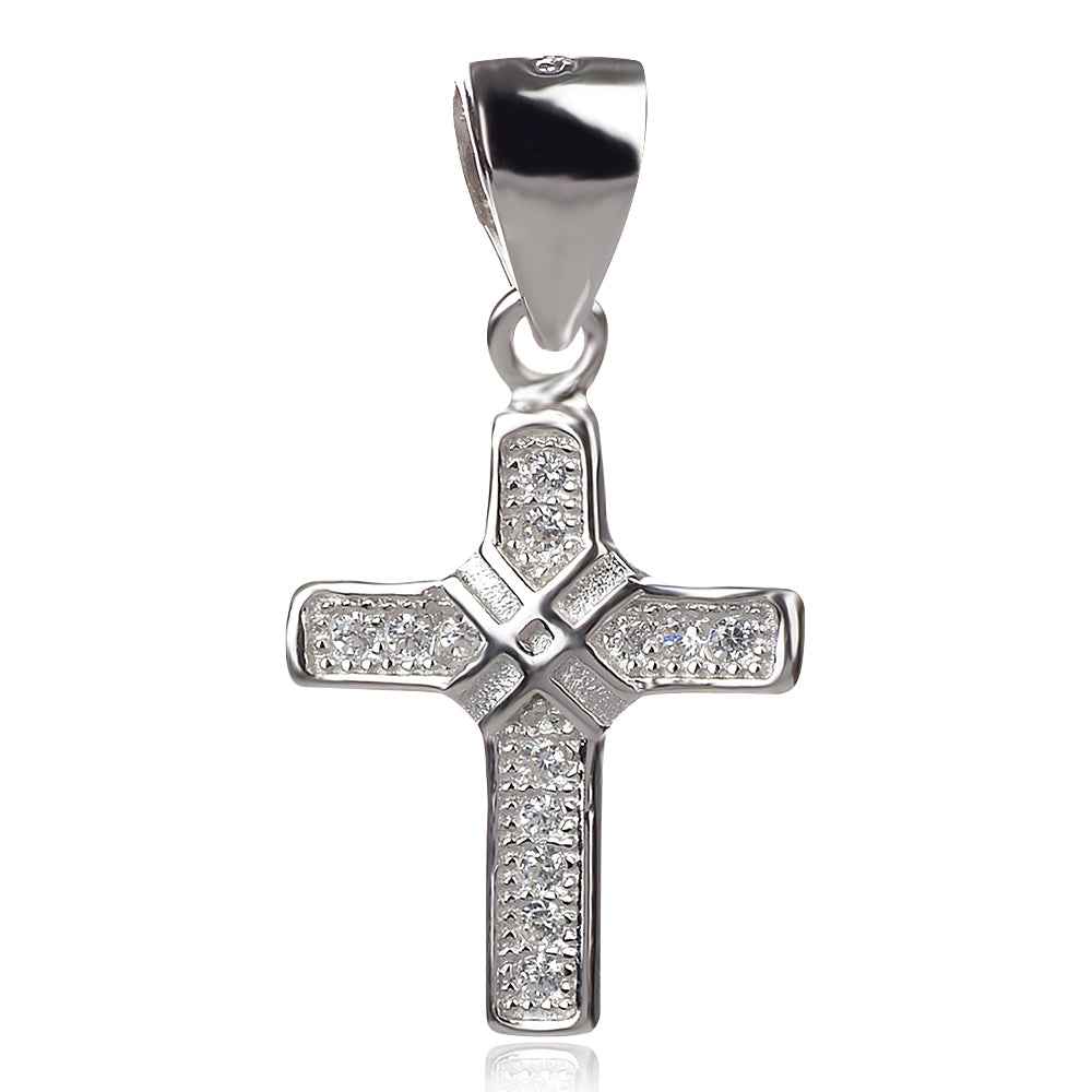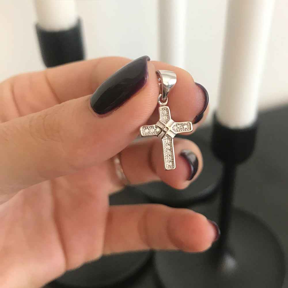 Сребърно православно кръстче с циконии, инкрустирани в сребърни каси. Бижуто е родирано, което гарантира дълготрайния му блясък. Нежно и миниатюрно, кръстчето е подходящо за подарък за погача на бебе или кръщене. Може да се комбинира със синджир (виж тук).