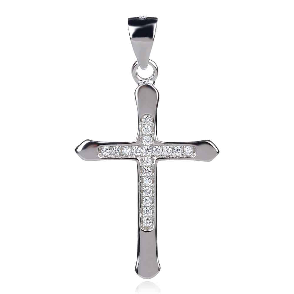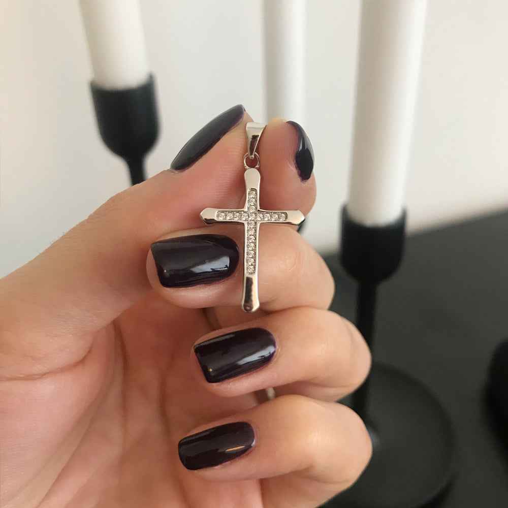Православен сребърен кръст с цирконии. Камъните са монтирани в сребърни каси, а перфектната полировка и родиевото покритие гарантират дълготрайния блясък на бижуто. Кръстът е подходящ за кръщене.
