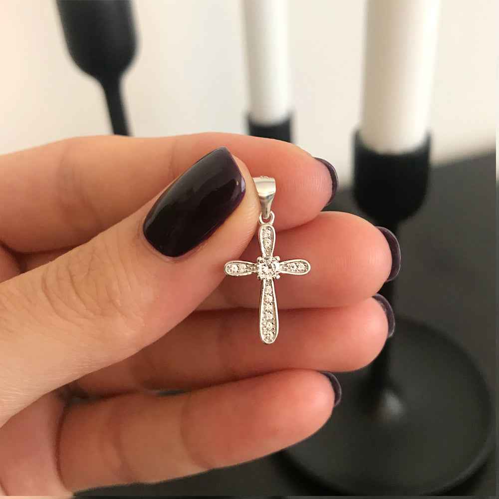 Малко сребърно кръстче с цирконии, инкрустирани в сребърни каси. Бижуто е родирано, което предпазва среброто от оксидация и гарантира дълготрайния му блясък. Моделът е подходящ за кръщене. Може да се комбинира със синджир (виж тук).