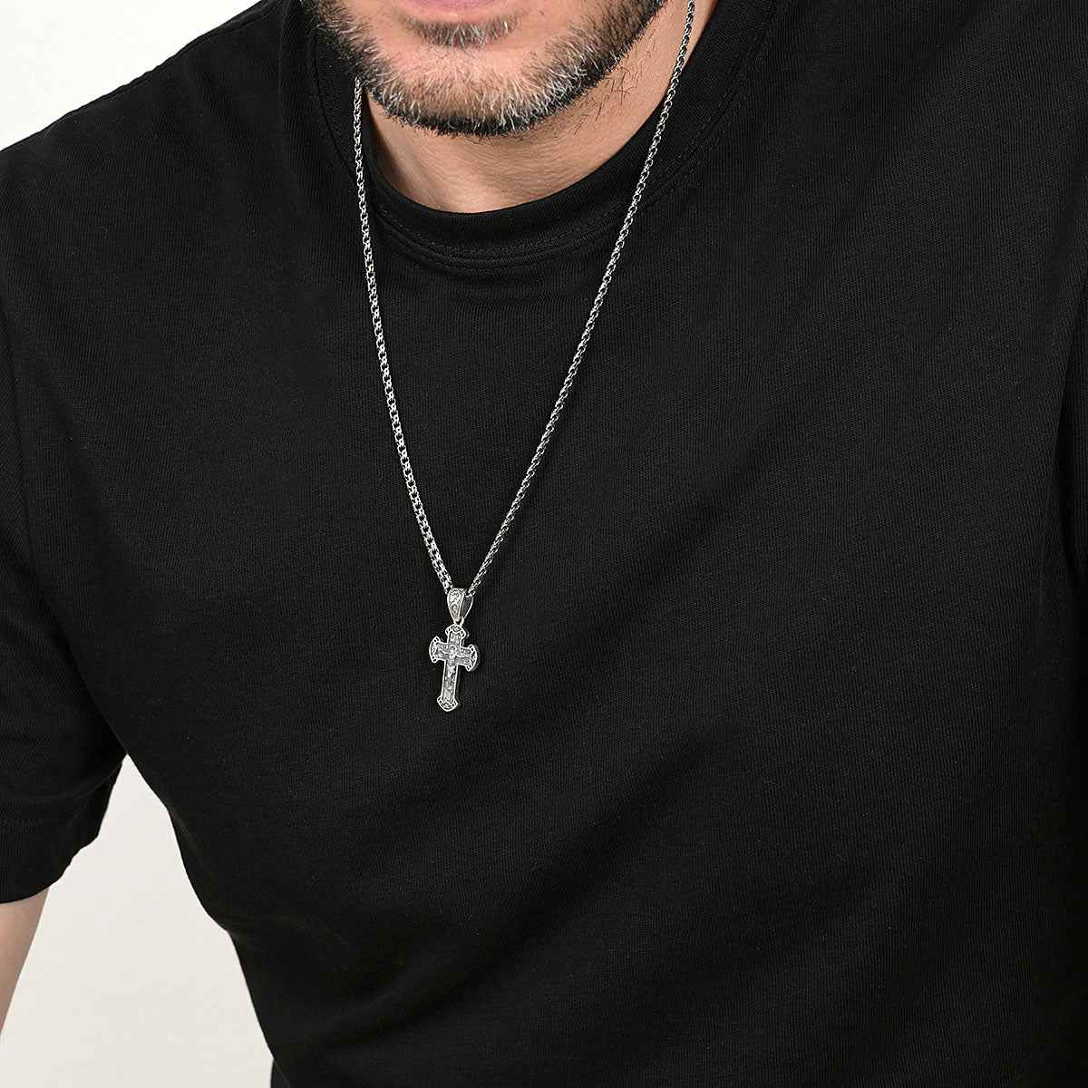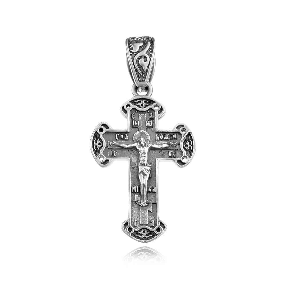 Мъжки сребърен кръст с разпятие на лицето и “Спаси и сохрани” на гърба. Кръстът е с прецизна изработка и фабрична оксидация, която подчертава релефните декоративни елементи.