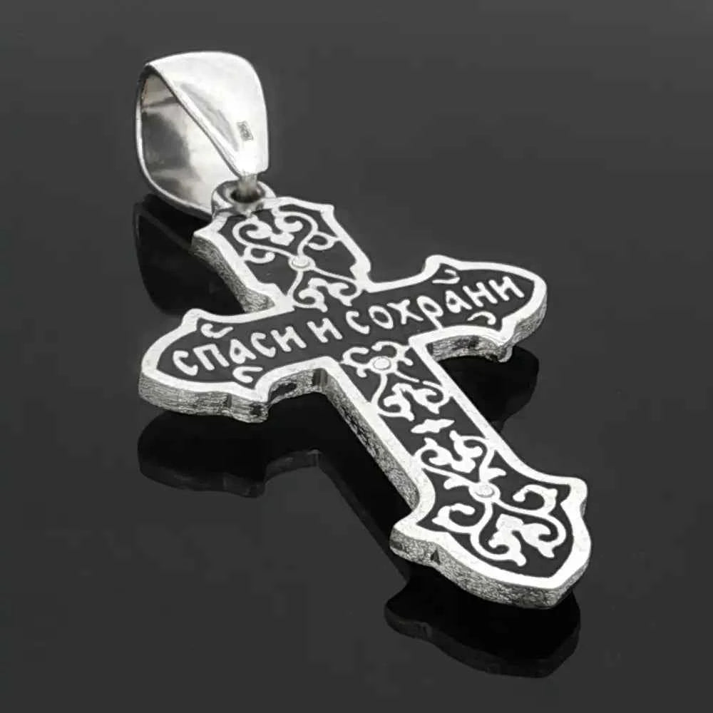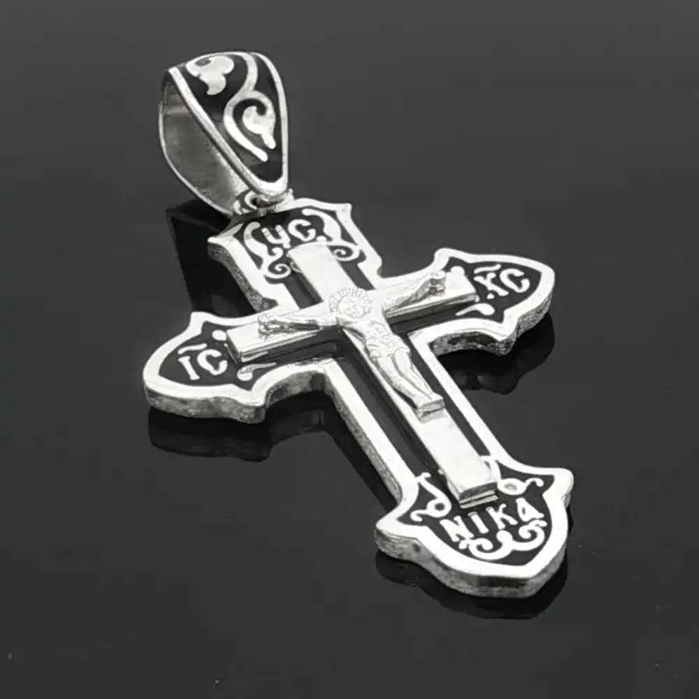 Православен сребърен кръст с разпятие, фина изработка и ръчно апликиран черен емайл.