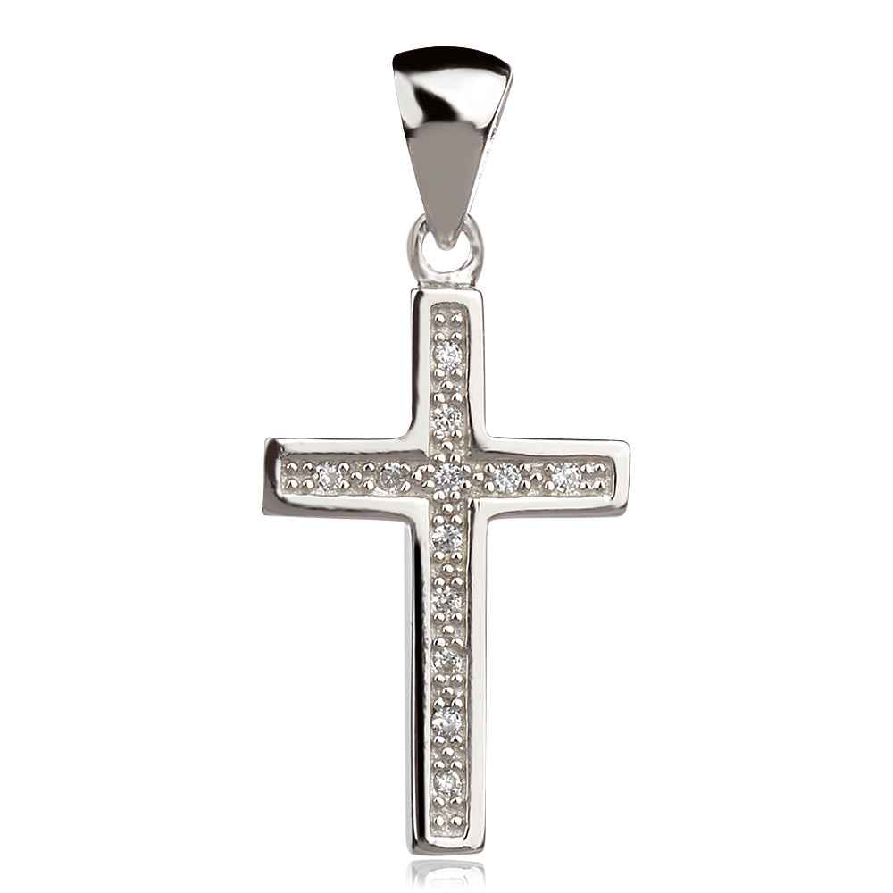 Класически сребърен кръст с цирконии. Камъните са инкрустирани в сребърни каси, а родиевото покритие предпазва бижуто от оксидация и гарантира дълготрайния му блясък.