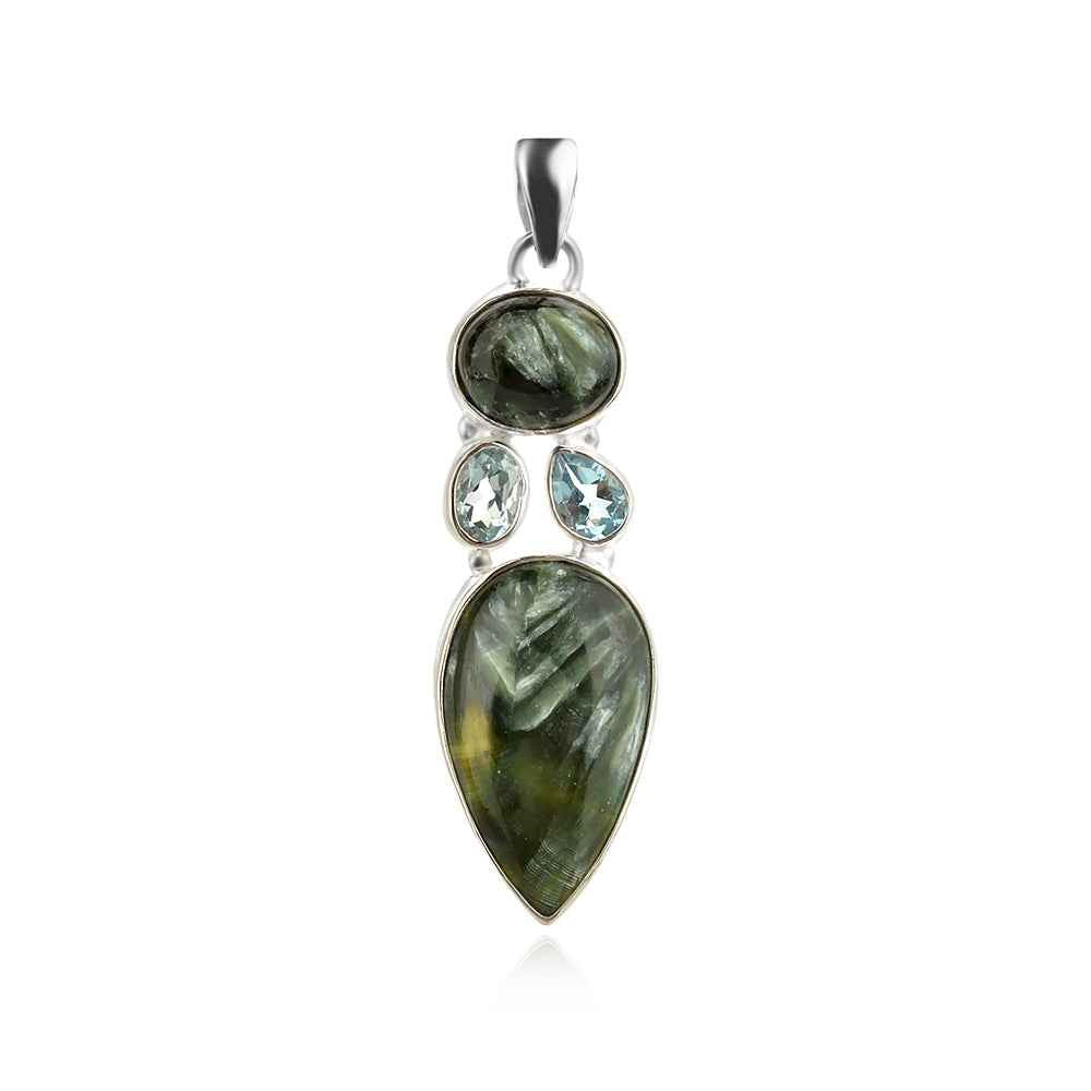 Сребърен медальон с натурални фасетирани сини топази и серафинити кабошон капка и елипса в семпъл обков. Камъните са с естествените си включения и микропукнатини и не са преминали термична обработка за допълнително подсилване на цвета.