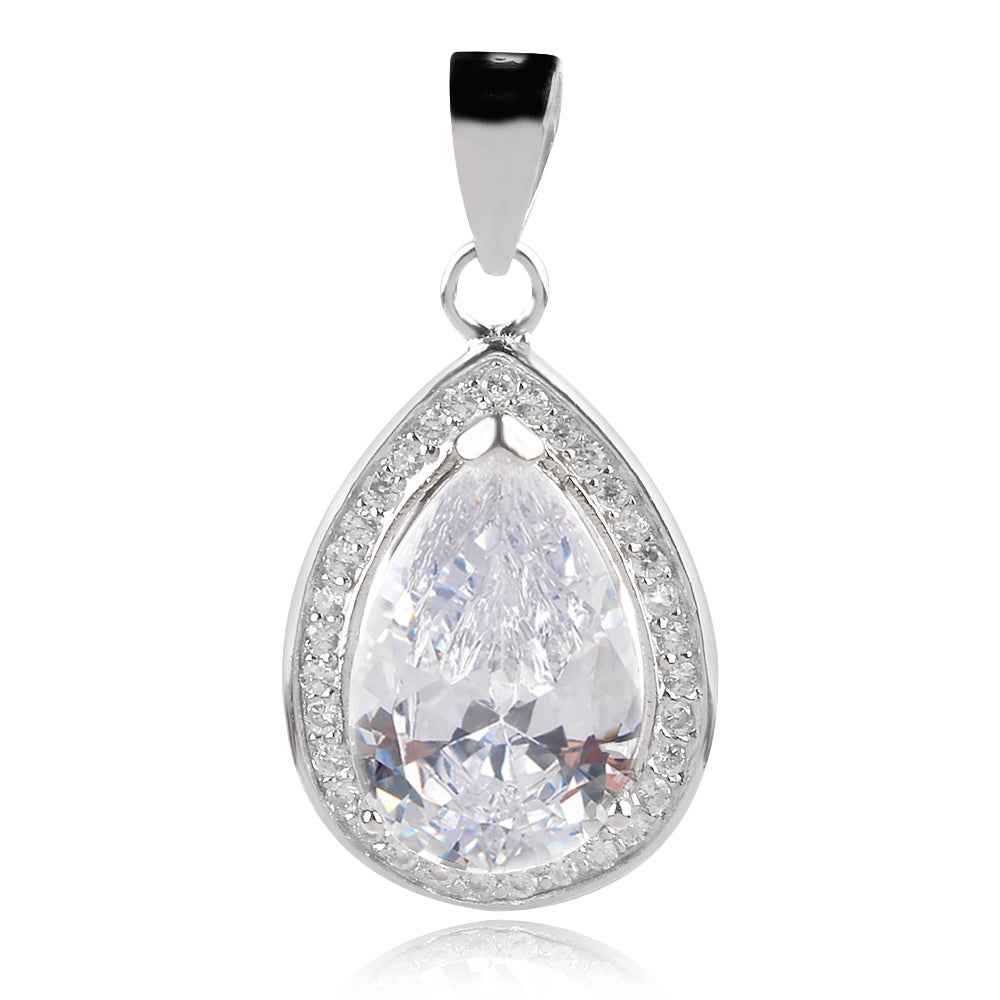 Сребърен медальон с красив капковиден циркон с перфектен блясък в рамка от малки циркони. Родиевото покритие на бижуто предпазва среброто от оксидация.