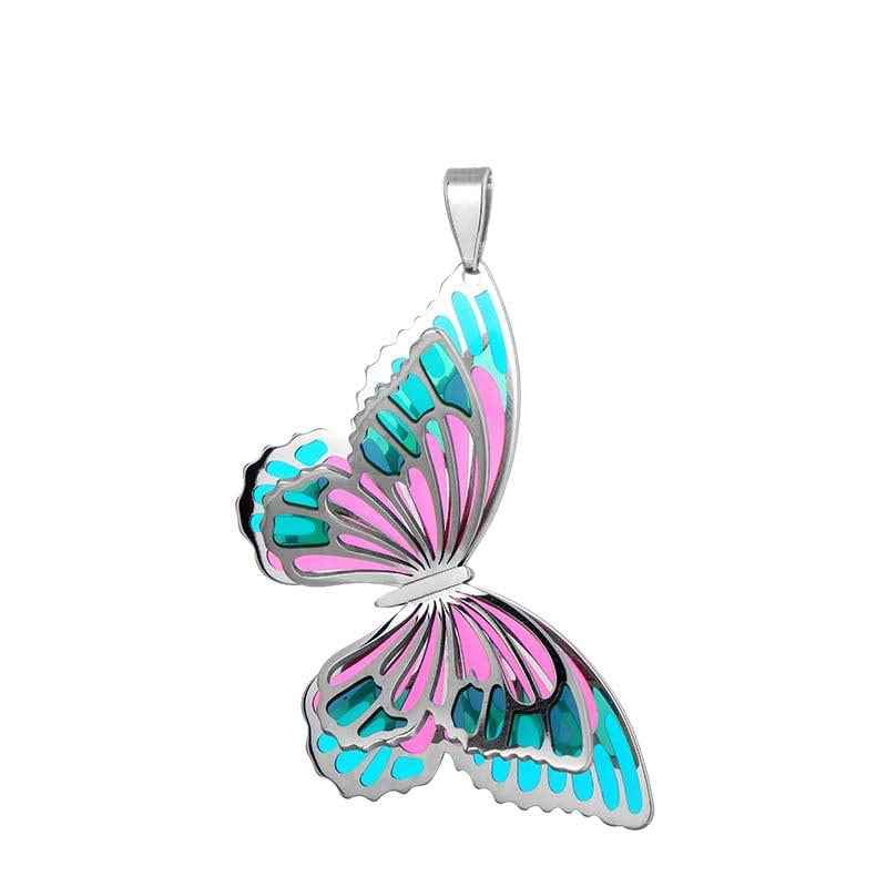 Ефектен сребърен медальон с форма на пеперуда, ръчно изрисувани с цветен емайл. Медальонът с прецизно родиево покритие, което предпазва среброто от оксидация и запазва блясъка на бижуто.