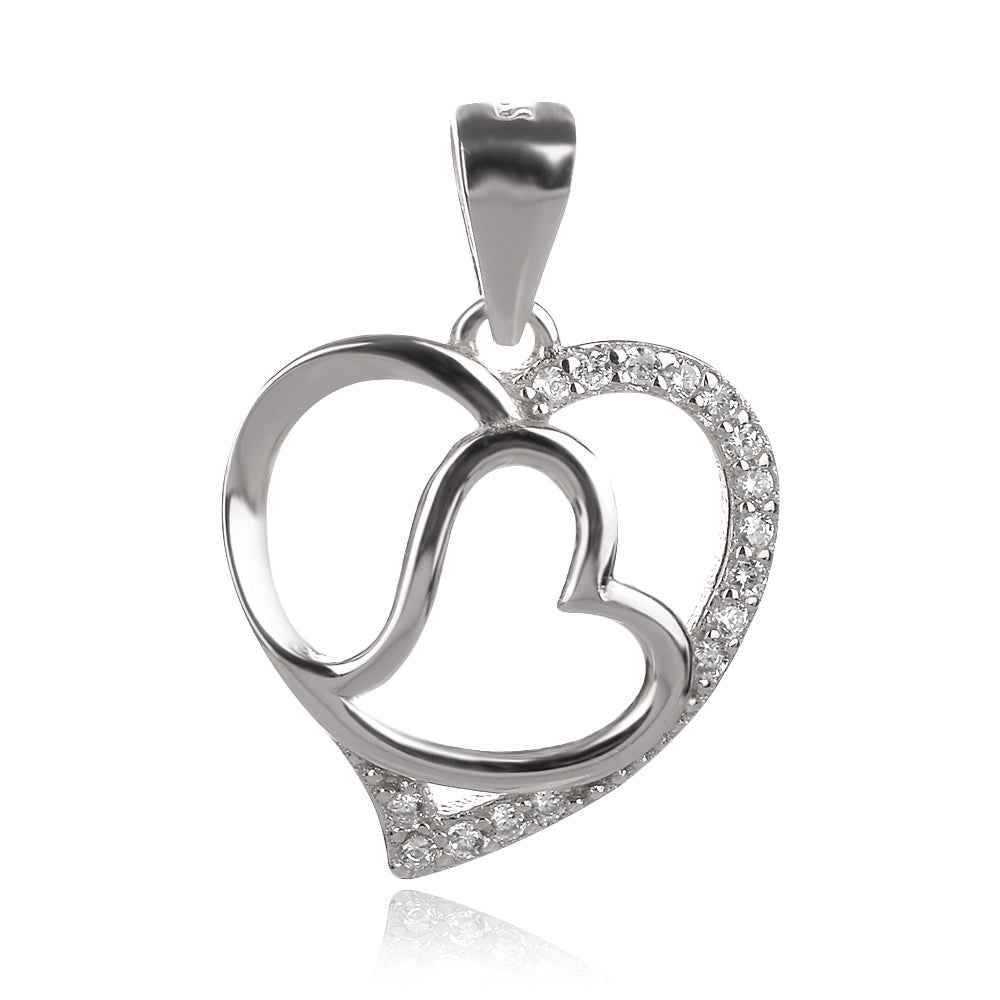 Сребърен медальон във формата на две вплетени сърца с ръчно инкрустирани циркони. Прекрасно символично бижу с фабрично родиево покритие, което предпачва среброто от оксидация.
