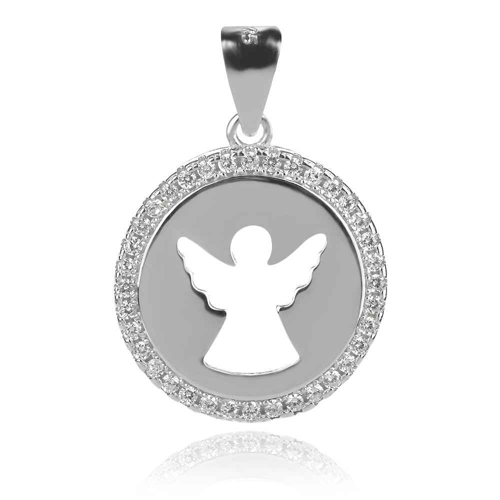 Сребърен медальон полирано стилизирано ангелче върху монетка с кант от цирконии. Малко изящно талисманче за късмет и сбъднати желания.