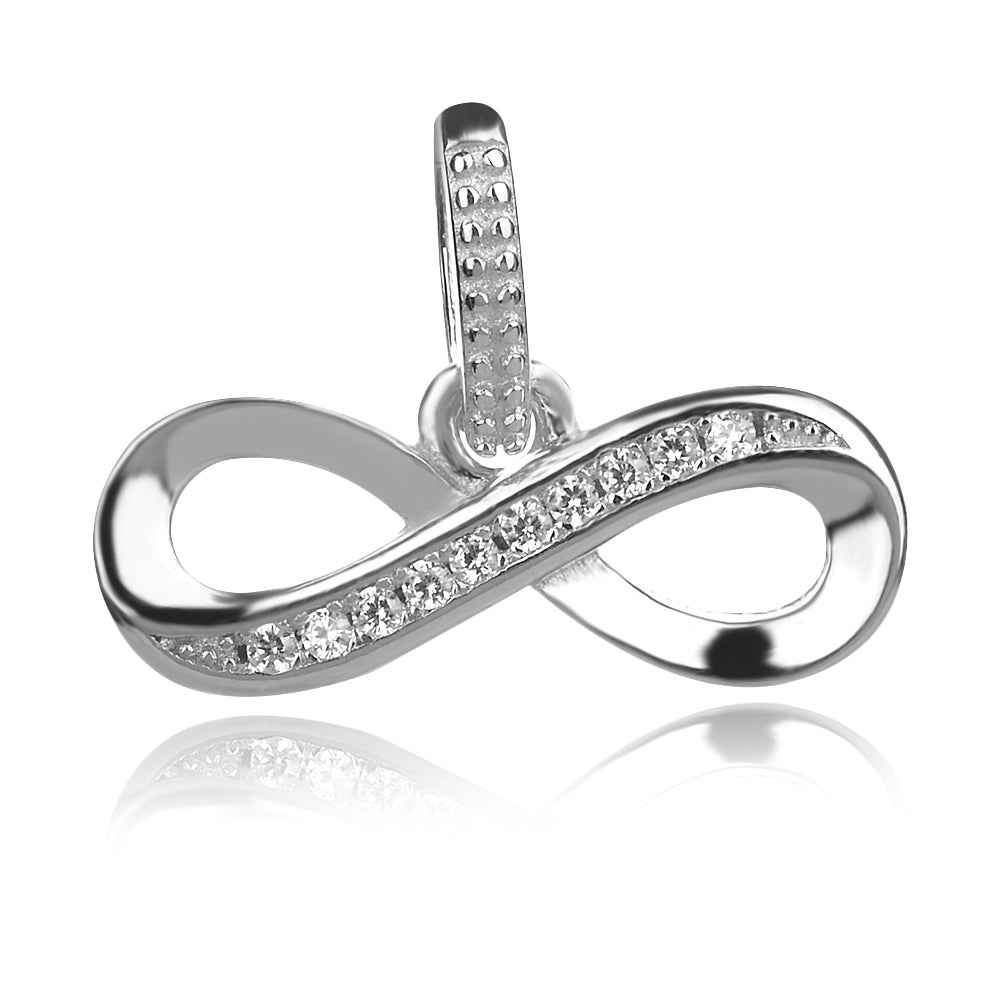 Сребърен медальон знак за безкрайност с инкрустирани циркони. Перфектната полировка и родиевото покритие предпазват среброто от оксидация и гарантират блясъка на бижуто.