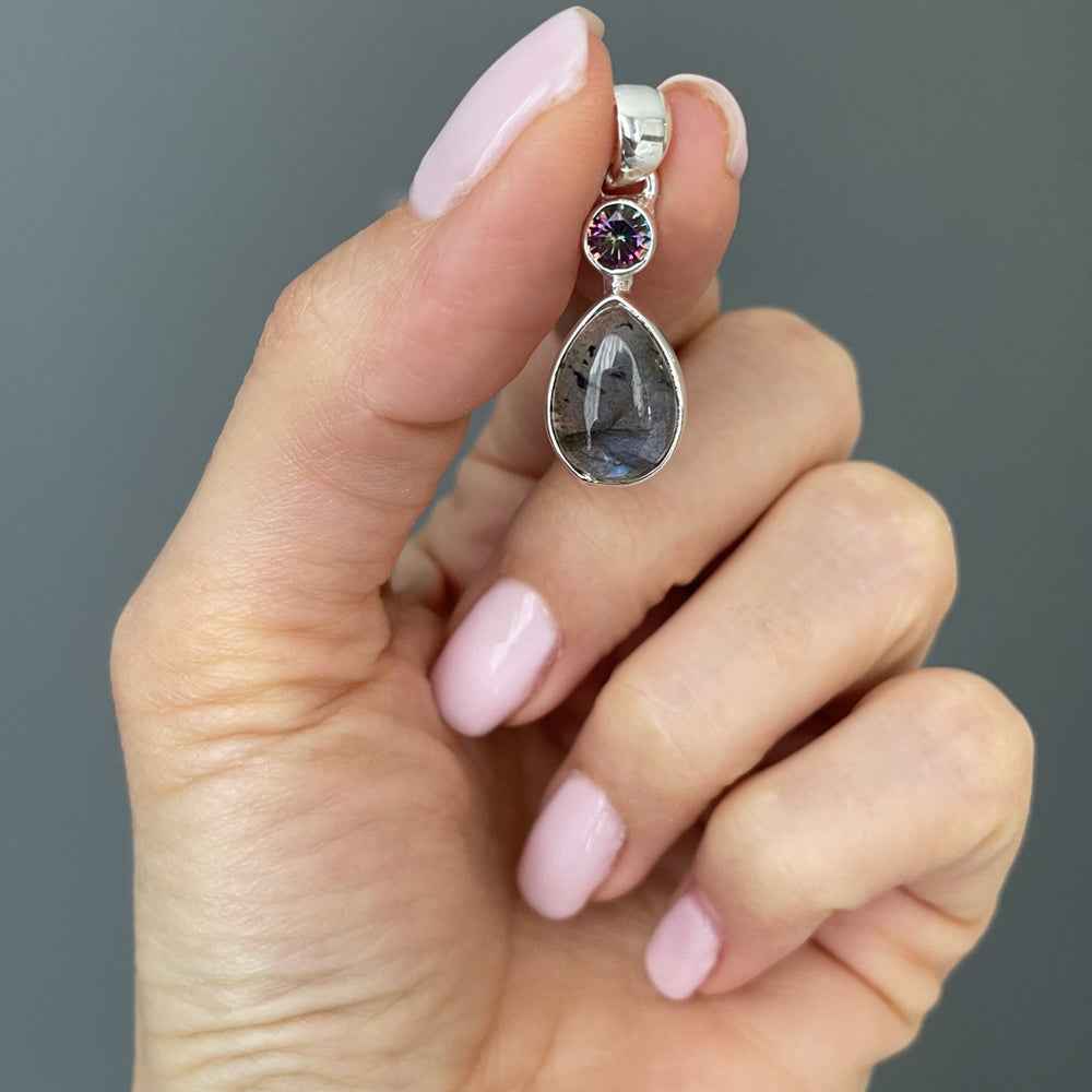 Сребърен медальон с естествен лабрадорит и мистик топаз в семпъл обков. Камъните са с естествените си включения и микропукнатини и не са преминали термична обработка за допълнително подсилване на цвета.