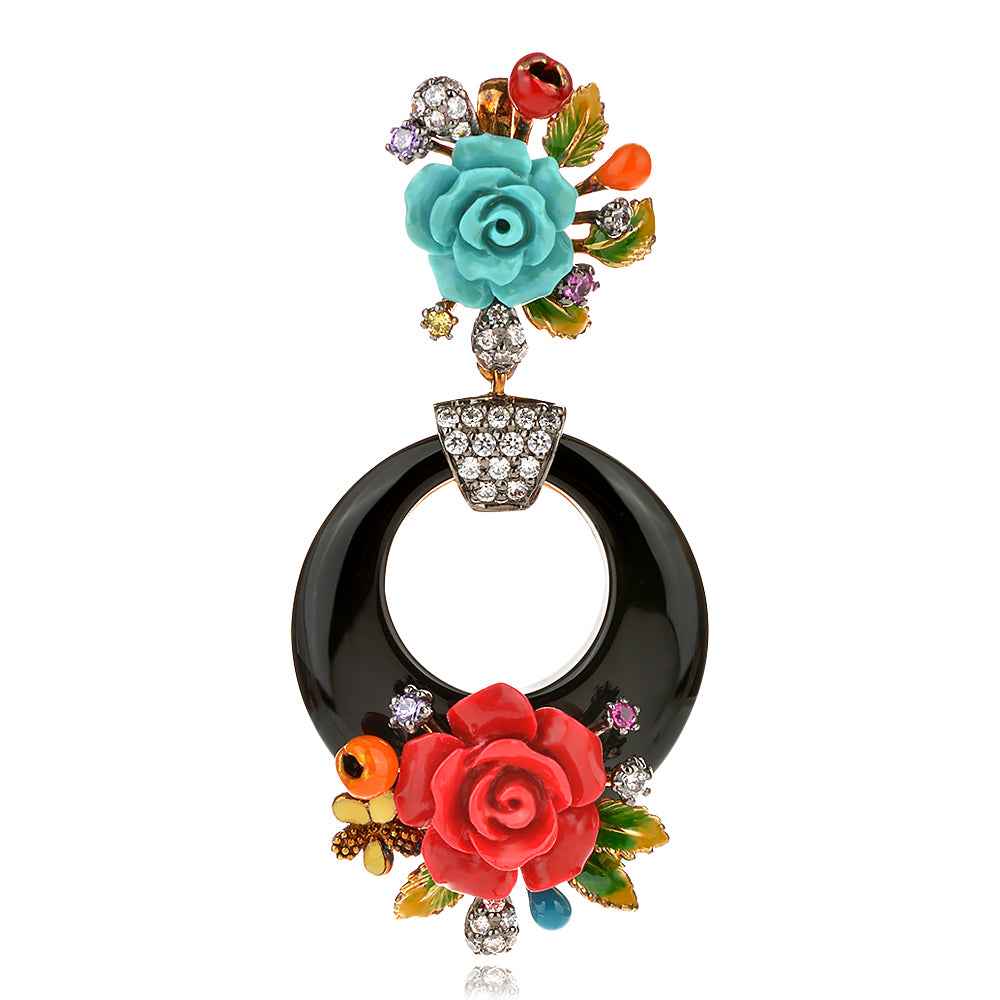 Изящен сребърен медальон на италианския луксозен бранд GANEZZI. Бижуто е с позлата, циркони, емайл, черен оникс и розички от пресован корал.