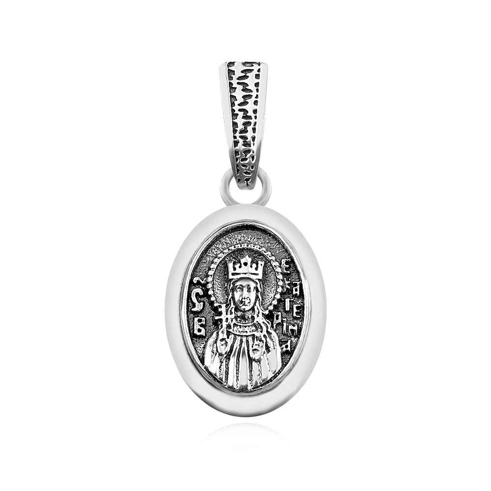 Сребърен двулицев медальон с лика на Света Екатерина с прецизна детайлна изработка. Медальонът е с оксидация, която подчертава релефните елементи.