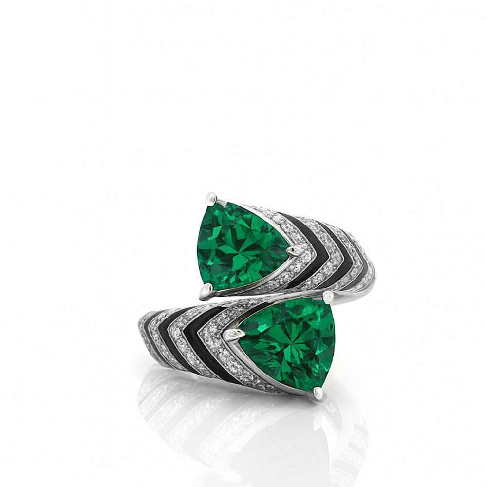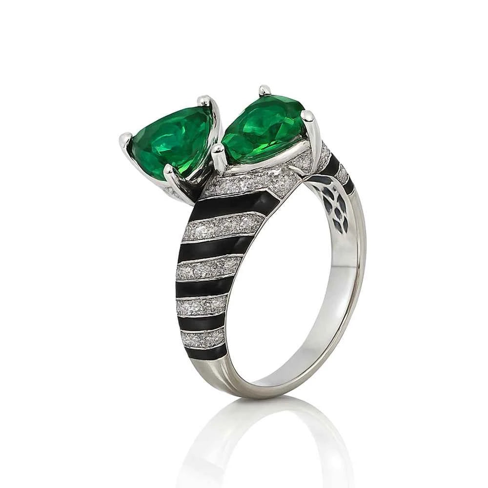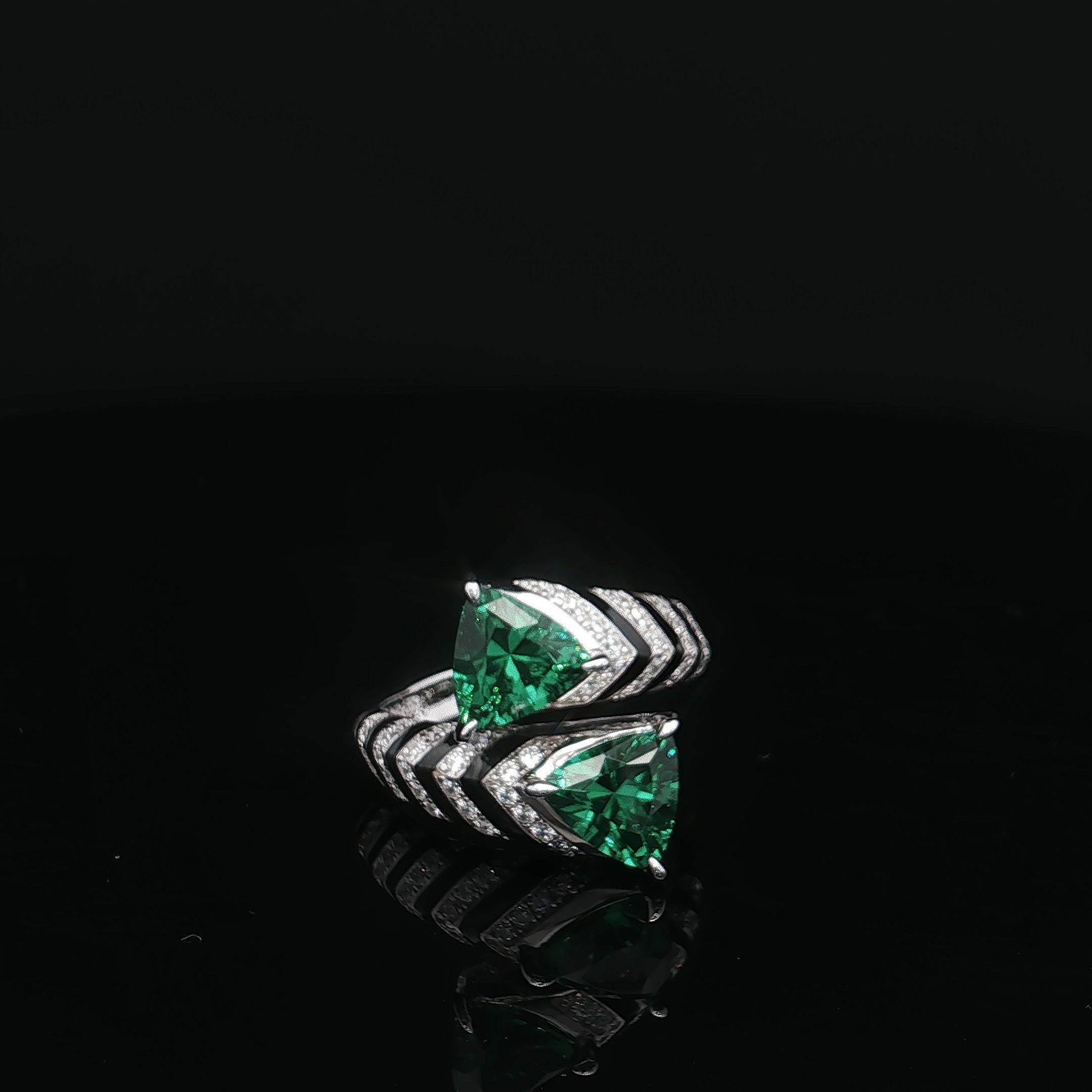 Изработен от сребро 925, този сребърен пръстен съчетава архитектурна линия с прецизно подредени цирконии и фин черен емайл. Контрастът между цветовете е умишлен и категоричен. Зелените акценти добавят силен фокус и усещане за завършен, колекционерски дизайн.