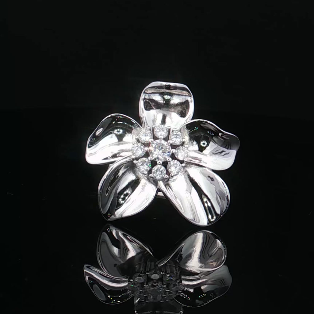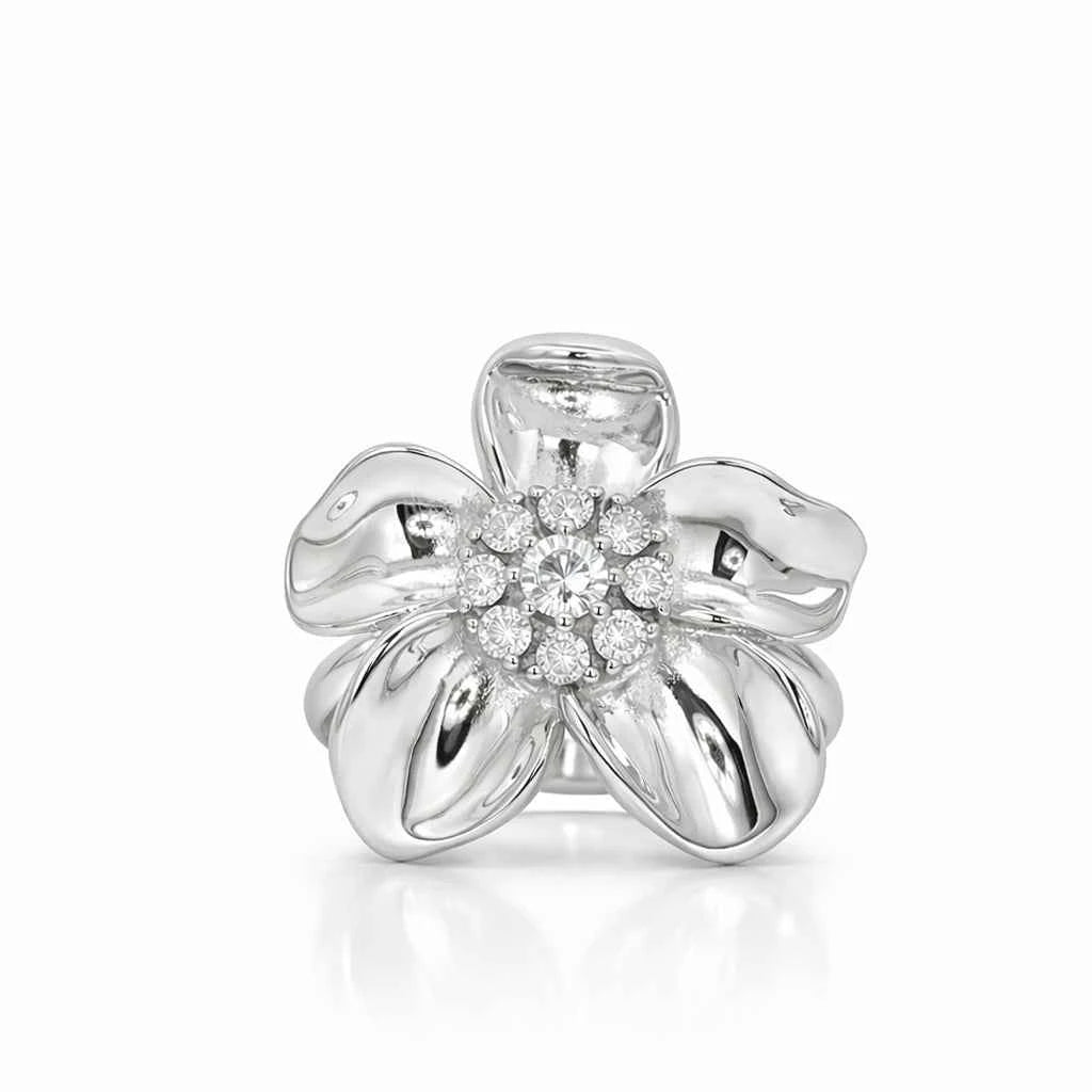 Този сребърен пръстен е изграден около изразителен флорален мотив с мек обем и балансирани линии. Централната композиция от фино подредени камъни придава светлина и завършеност, а гладката повърхност добавя ярък, луксозен акцент.