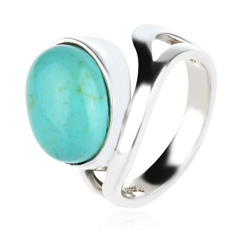Класически сребърен пръстен с полиран тюркоаз кабошон. Семплия асиметричен обков подчертава красотата на камъка, а плътната халка приляга удобно на пръста. Размерът на пръстена е фиксиран и не подлежи на корекция.