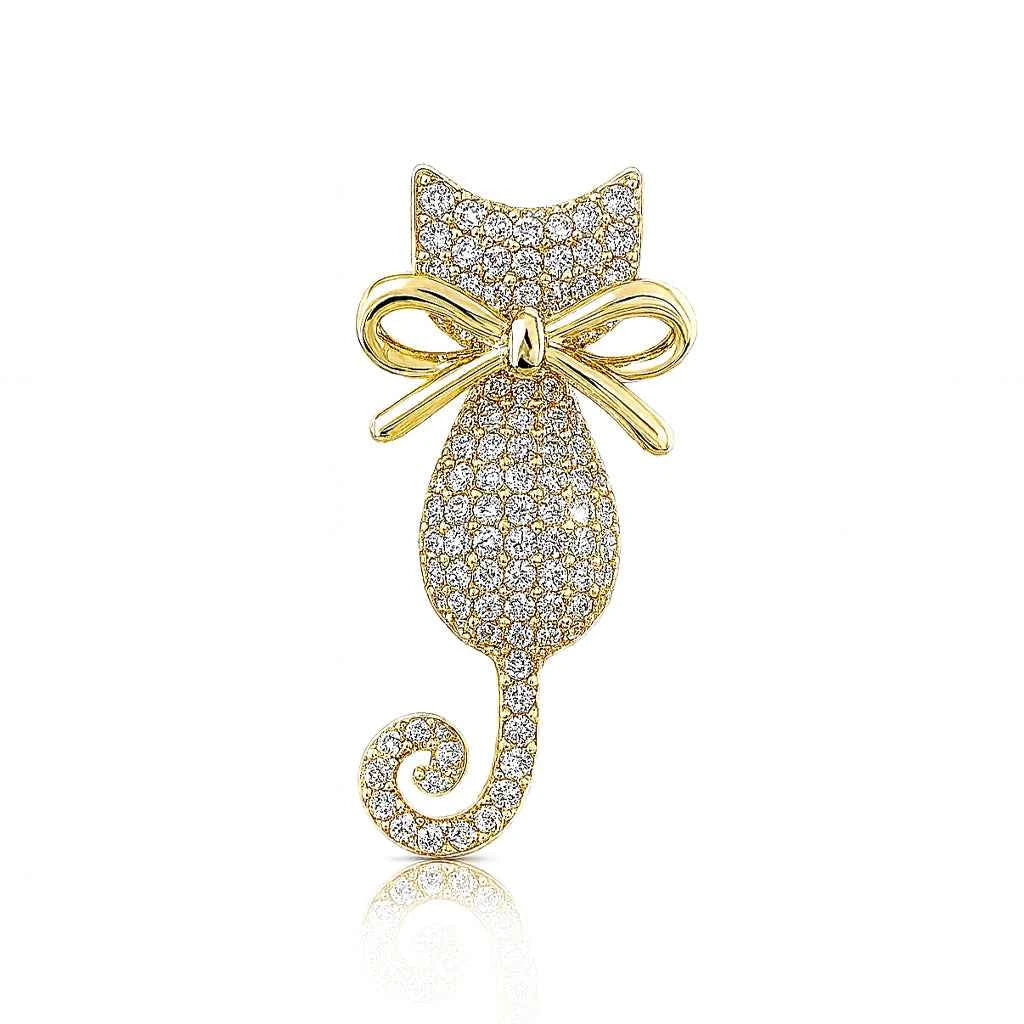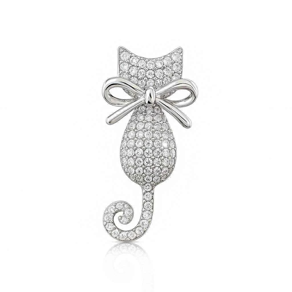 Сребърна брошка котка с цирконии и деликатна панделка – закачлив и стилен подарък за любителите на котки.