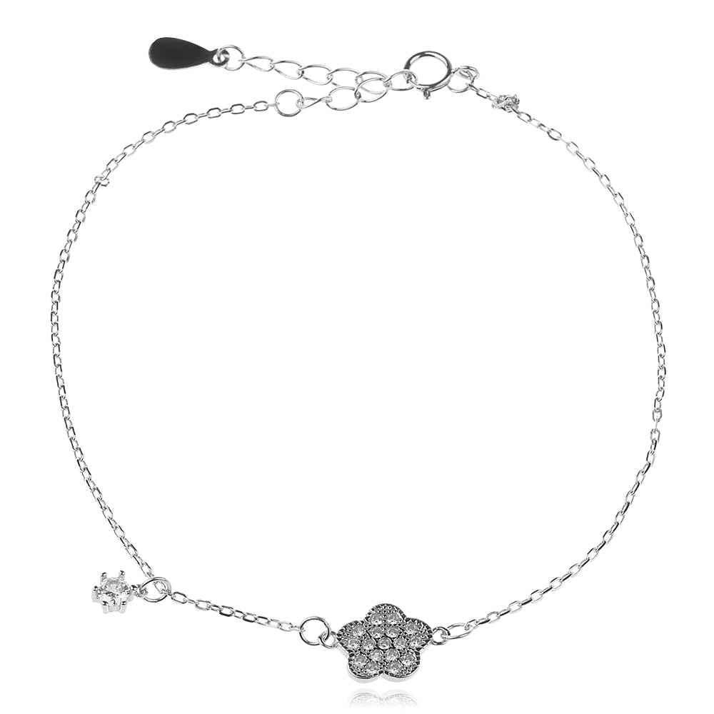 Фина сребърна гривна със стилизирано цвете, обсипано с цирконии. Бижу с фин блясък и цветно настроение.