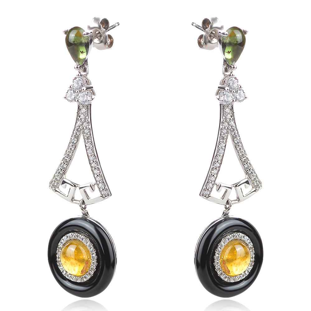 Сребърни обеци с жълти кръгли и зелени капковидни турмалини кабошон, дискове от черен оникс и цирконии. Обеците са на щифт. Подвижните връзки между елементите на обеците ги карат красиво да трептят при всяко движение. Интересната форма и средната дължина ги правят чудесен избор за дами с обло, кръгло или сърцевидно лице.