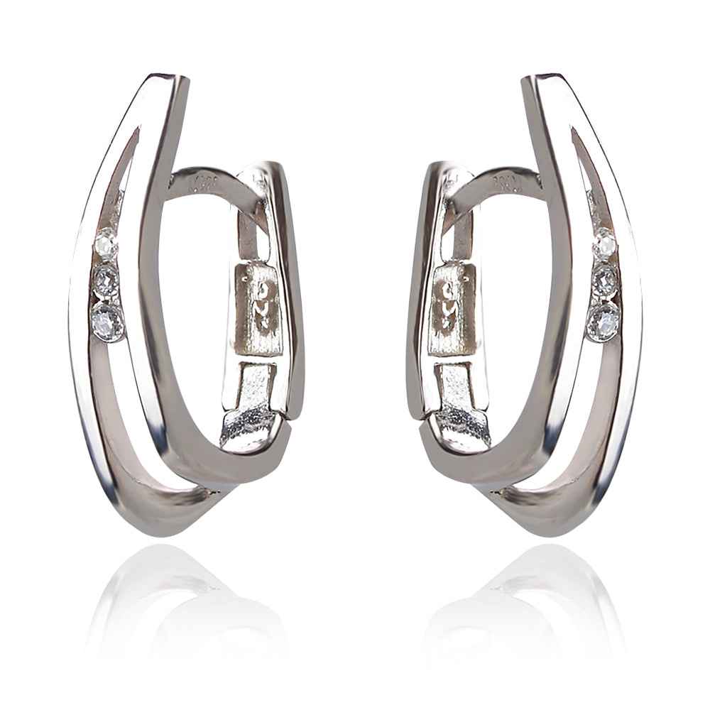 Сребърни обеци с цирконии на удобно английско закопчаване. Родиевото покритие предпазва среброто от потъмняване и гарантира блясъка на бижуто.