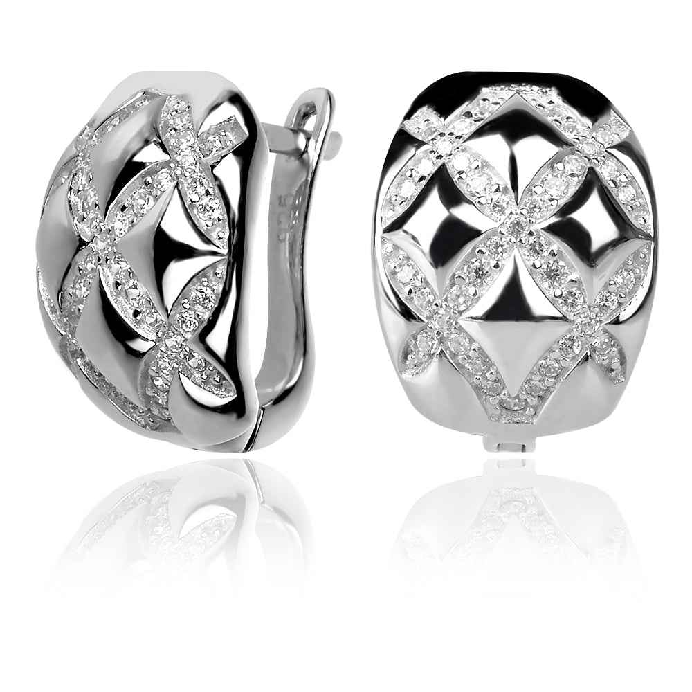 Сребърни обеци на английско закопчаване с кубични цирконии и родиево покритие. Перфектен завършек на ежедневна или вечерна визия. Нежно бижу със семпъл блясък в класически стил.
