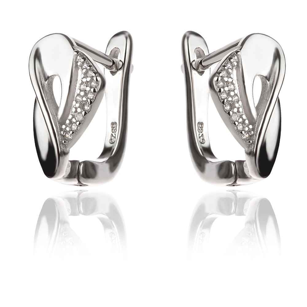 Малки сребърни обеци с абстрактна форма с инкрустирани цирконии. Обеците са на удобно английско закопчаване. Родиевото покритие предпазва среброто от потъмняване и гарантира блясъка на бижуто.