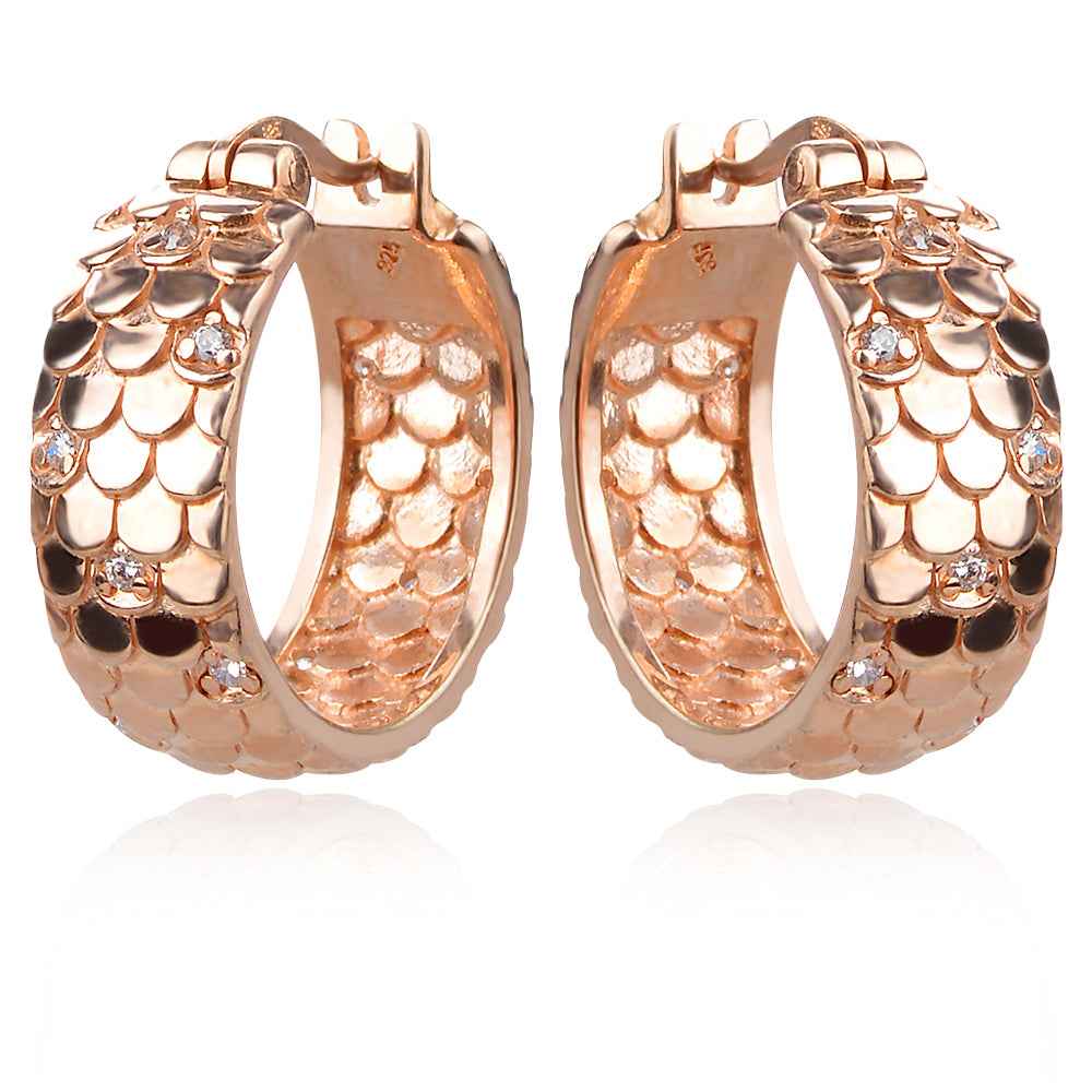 Италиански сребърни обеци халки с розова позлата и цирконии. Прецизният финиш от змийски елементи с инкрустирани цирконии ще впечатлят и най-взискателната към детайла дама. Перфектната полировка допринася за ефектното излъчване на обеците.