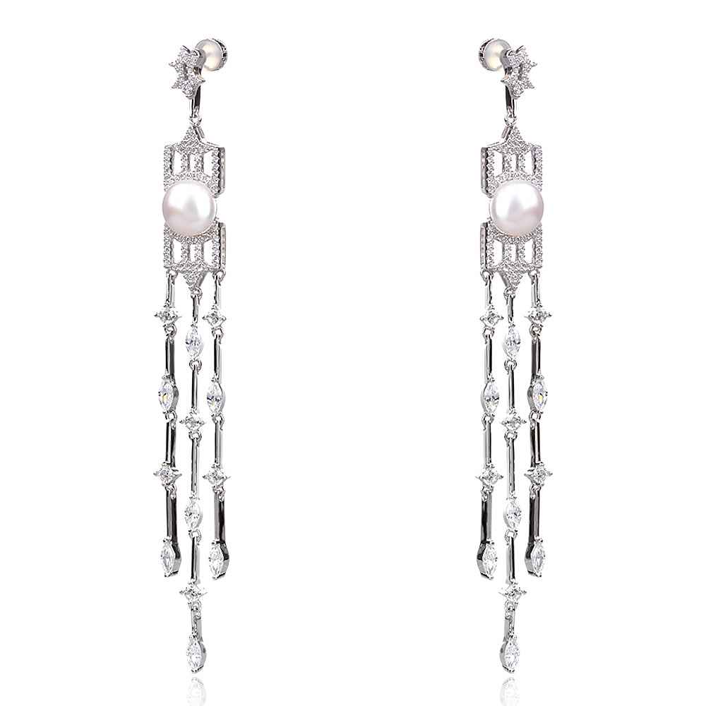 Дълги висящи сребърни обеци с цирконии и бяла перла. Впечатляващ дизайн по модел на APM Monaco. Бижу, което ще привлече погледите и ще предизвика комплименти!
