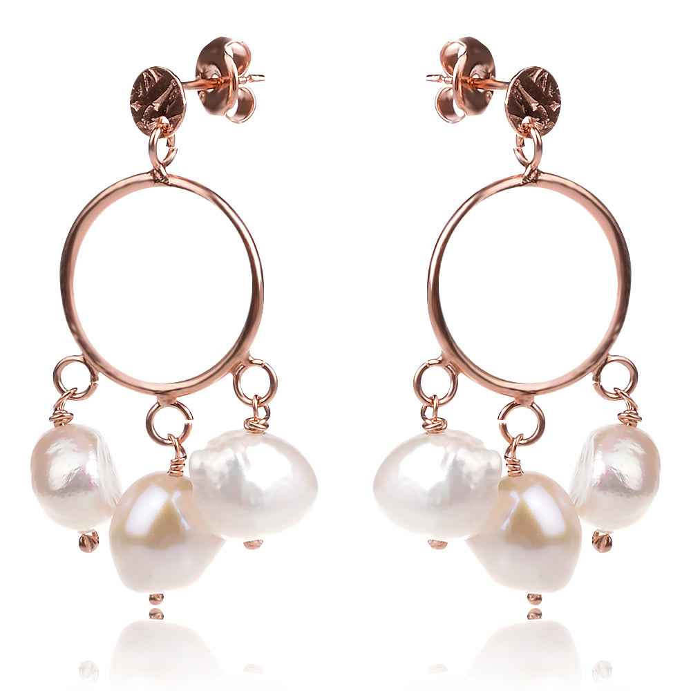 Сребърни обеци с розова позлата и малки барокови перли. Тези атрактивни изкушения в Бохо стил, ще внесат характер и много настроение във визията. Лесно се съчетават както с по-класически аутфит, така и със смела визия в ярки цветове. Обеците са на щифт и плътно прилягат към мидичката на ухото.
