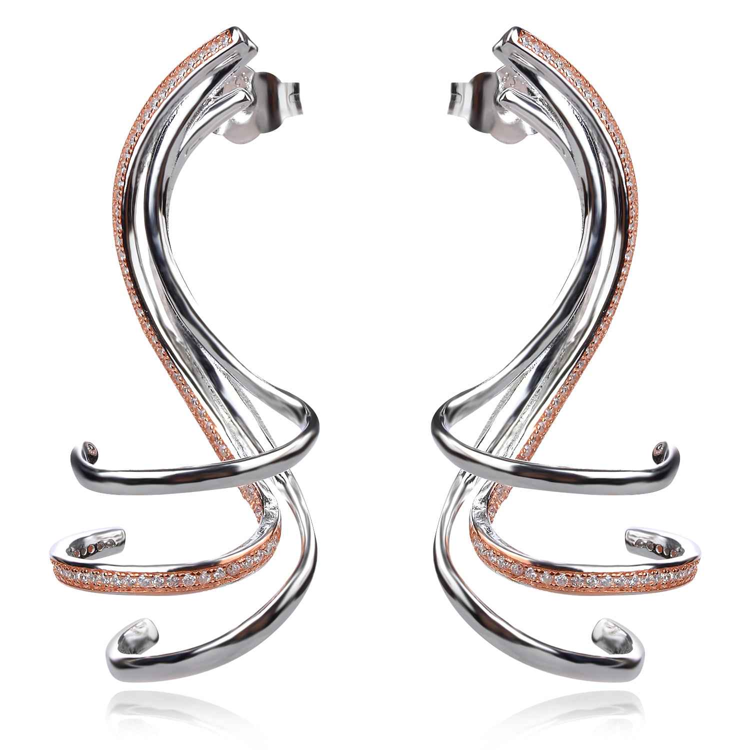 Ефектни сребърни обеци с родиево покритие и елементи с розова позлата, обсипани с малки кубични цирконии. Тези фантастични ефирни съвършенства ще привлекат мигновено погледите и ще подчертаят лицето. Фините полирани елементи красиво отразяват светлината, а нежните овални форми ще омекотят и най-строгата визия. Обеците са подходящ подарък за дами с изтънчен вкус и усет към нестандартните аксесоари.