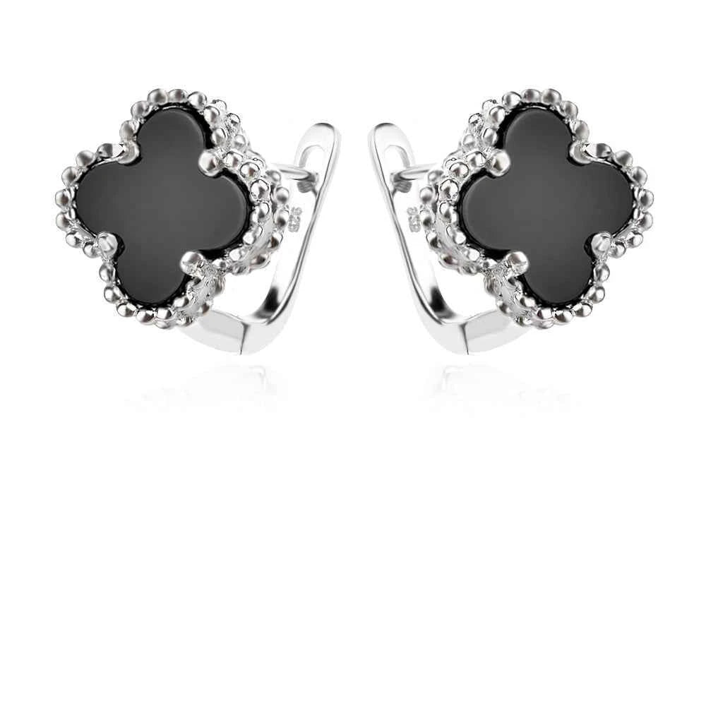 Нежни сребърни обеци с родиево покритие и стилизирани цветя от черен оникс. Тази вечна елегантност е вдъхновена от листата на детелината и напомня за колекциите на Van Cleef & Arpels. Обеците са с удобно английско закопчаване с широк борд, който придържа обецата плътно към ухото.