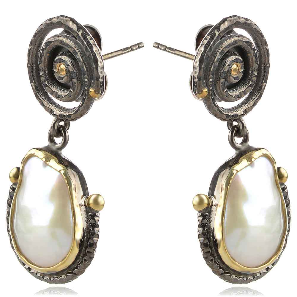 Дизайнерски сребърни обеци с позлата, рутений и перли Барок. Закопчаването е на щифт с винт.