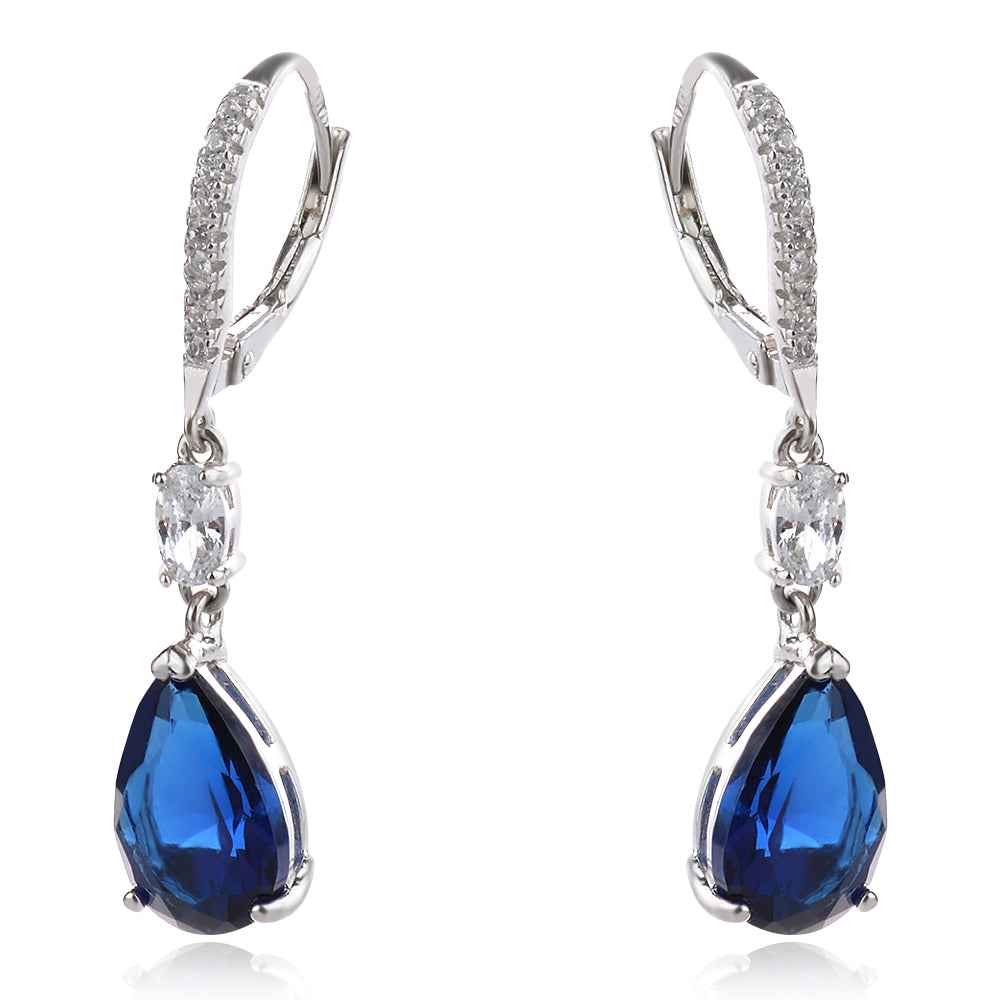 Изискани сребърни висящи обеци с красиво шлифован син капковиден циркон. Закопчаването е сигурно и удобно-с лостче, с декорирана с циркони предна част. Една вечна класика, която може да допълни по забележителен начин визия за всеки официален повод: сватба, бал, парти, новогодишна нощ…