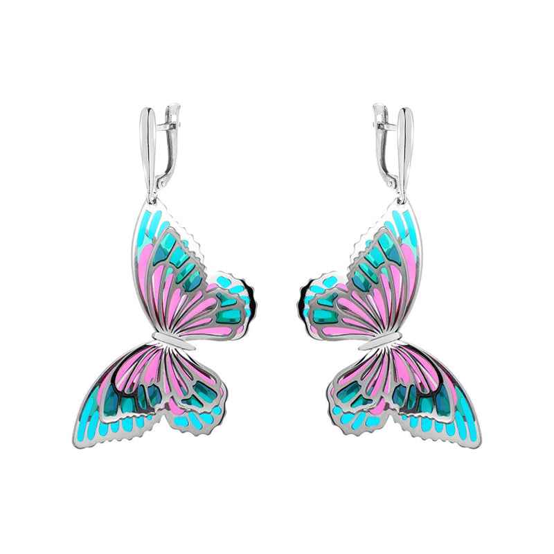 Ефектни сребърни обеци с форма на пеперуди, ръчно изрисувани с цветен емайл. Обеците са с удобно английско закопчаване и с прецизно родиево покритие, което предпазва среброто от оксидация и запазва блясъка на бижуто.