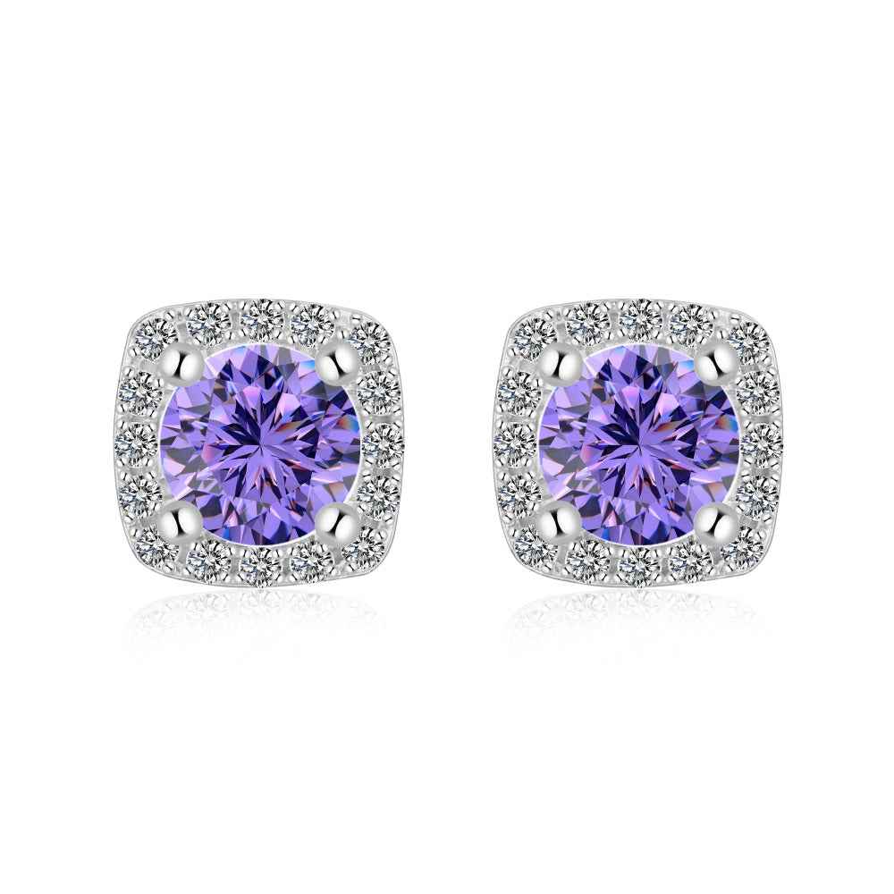 Сребърни обеци с лилав централен цирконий и контрастна рамка от бели камъни — съвременен акцент с характер.