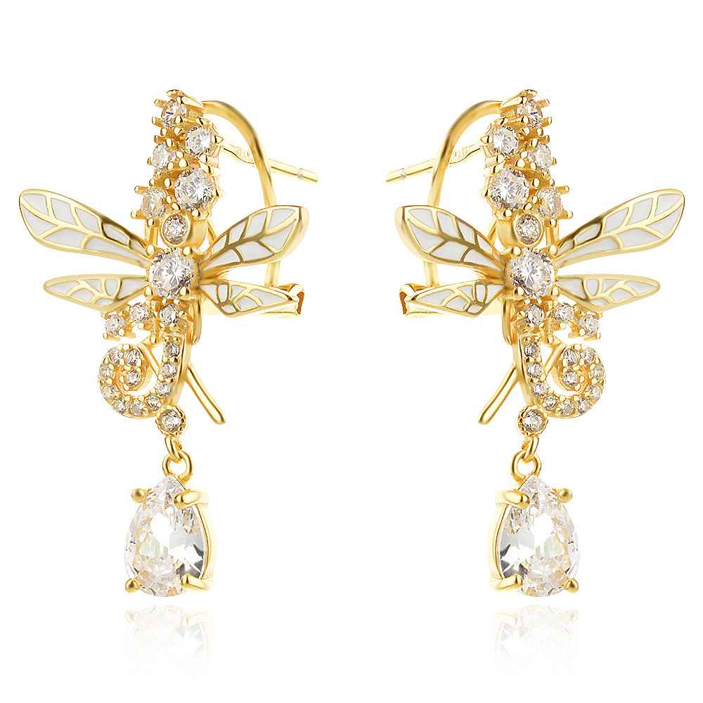 Приказни сребърни обеци с водно конче с ръчно апликиран бял емайл, цирконии и прецизна жълта позлата.