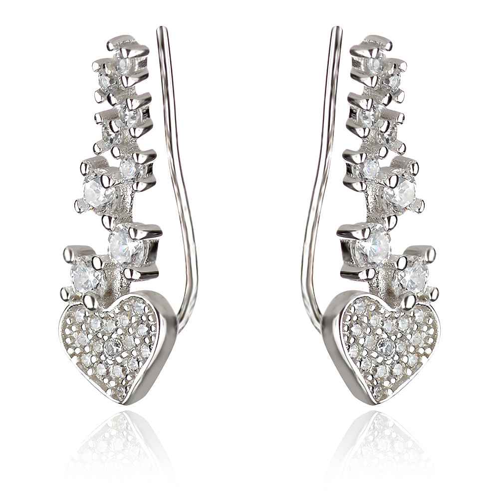Сребърни обеци тип "фиба" със сърчице и бели цирконии, които нежно прилягат на ушната мида.