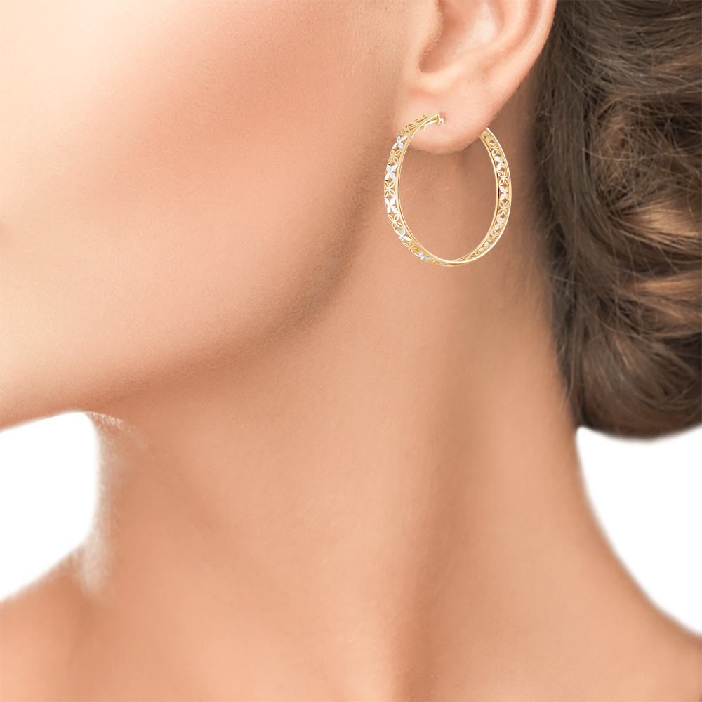 Изящни сребърни обеци халки с ажурен флорален профил и фина лазерна обработка. Обеците са с прецизна позлата и родиево покритие. Закопчаването е без панта.