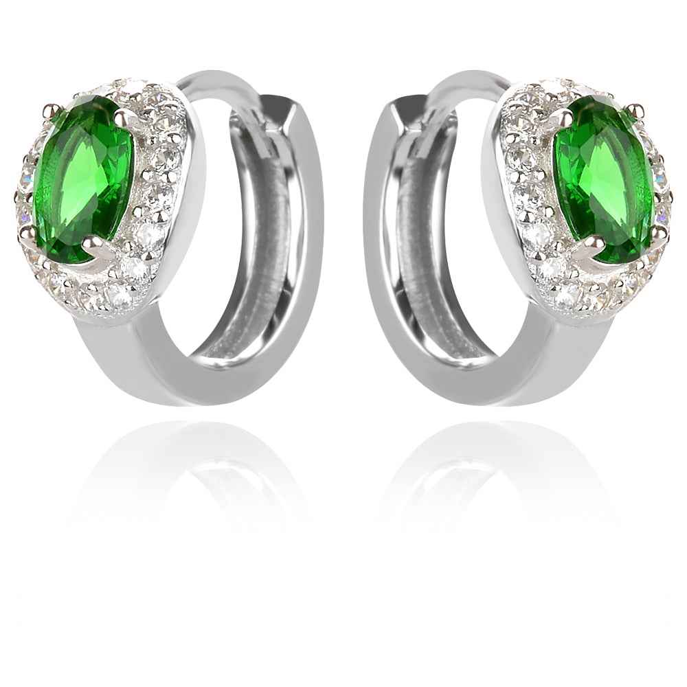 Малки сребърни обеци тип халкички с елипсовиден цирконий в зелен цвят. Обеците са с родиево покритие, което предпазва среброто от оксидация и запазва блясъка на бижуто. Щифтът е тънък и подходящ за детски ушички.
