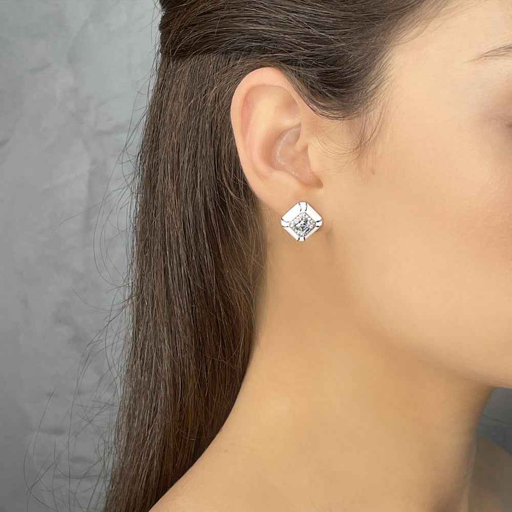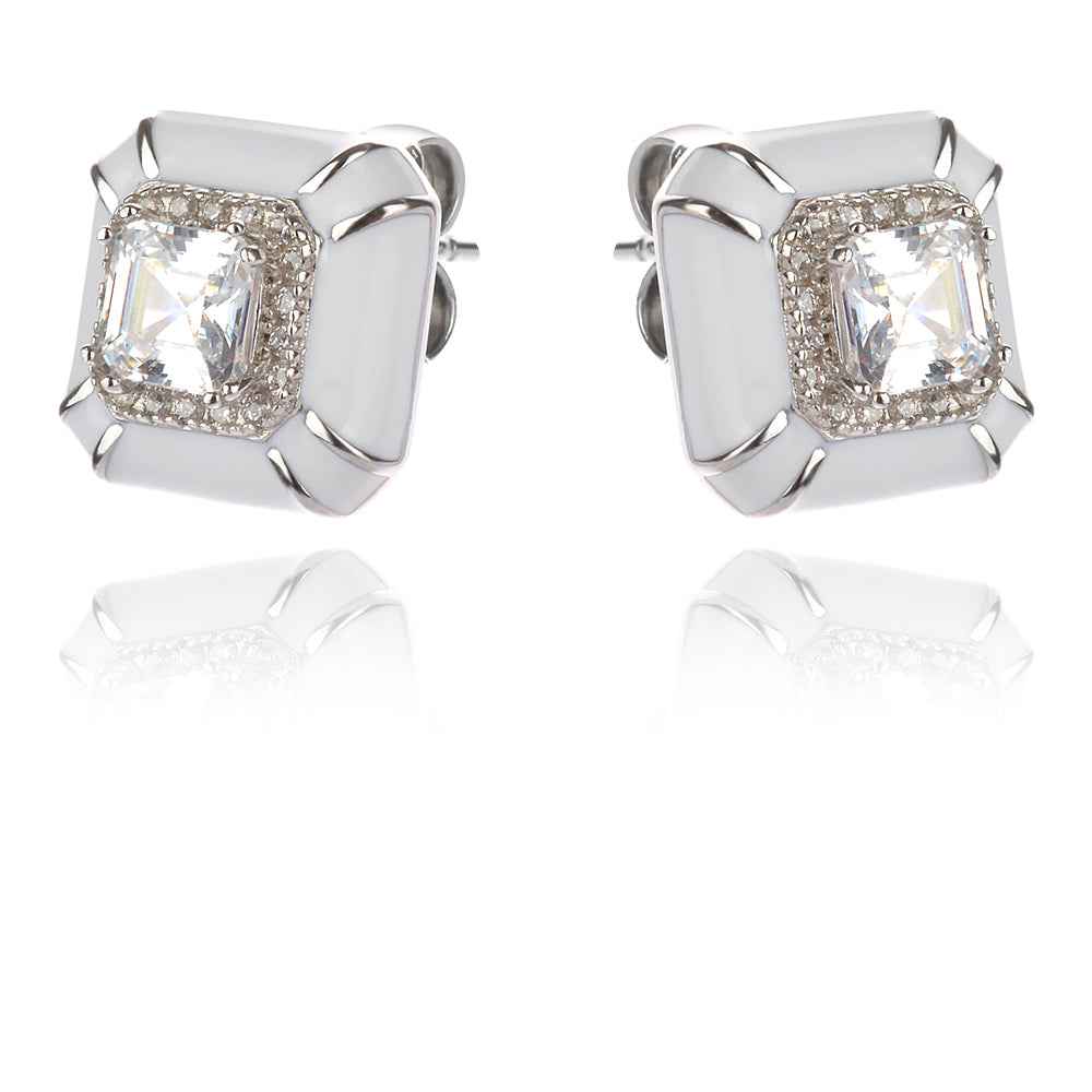 Изискани сребърни обеци с бял емайл и цирконии. Закопчаването е на щифт с винт.